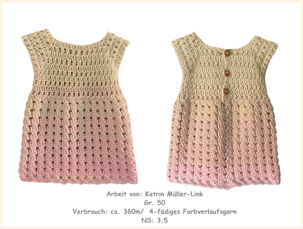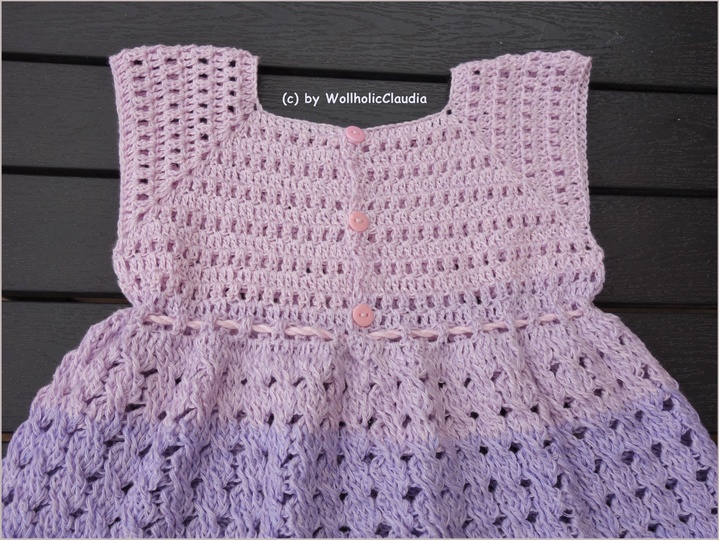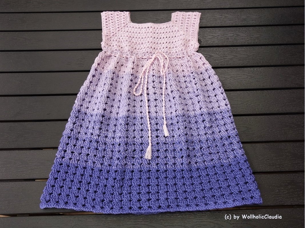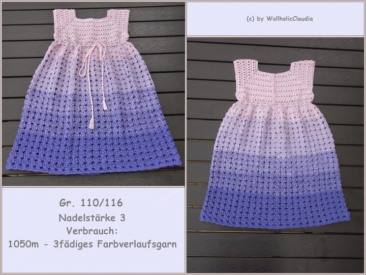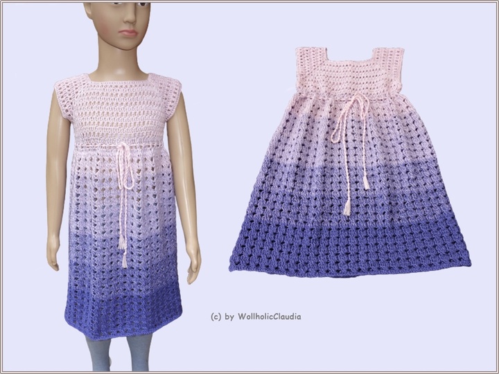 Das Kleid wird an einem Stück von oben nach unten gearbeitet (Rvo = Raglan von oben) und ist somit perfekt geeignet für Farbverlaufsgarne. Im Rücken befindet sich eine Knopfleiste. Die Kleidgröße und Länge kann individuell angepasst werden.