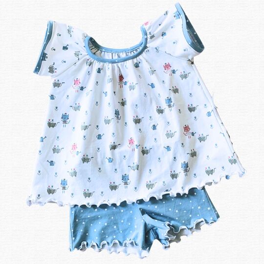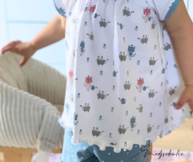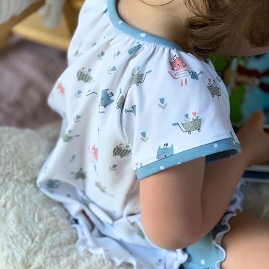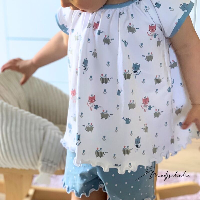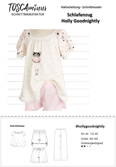 Holly Good Nightly ist ein Schnittmuster für einen süßen Kinderschlafanzug für Mädchen. Der Schlafanzug kann mehrfach kombiniert werden und enthält jeweils eine kurze und eine lange Hose. Für die kurze Hose gibt es mehrere Verarbeitungsngmöglichkeiten, z.B. als Boxershort oder Pumphöschen. Das Oberteil kann mit langen und kurzen Ärmeln genäht werden. Für den Ausschnitt kannst Du zwischen zwei Verarbeitungsmöglichkeiten wählen.