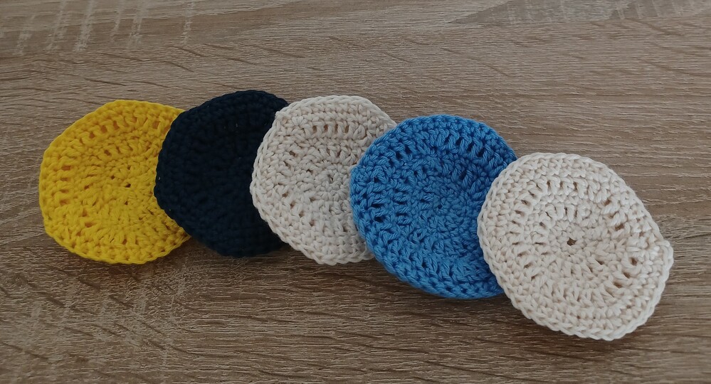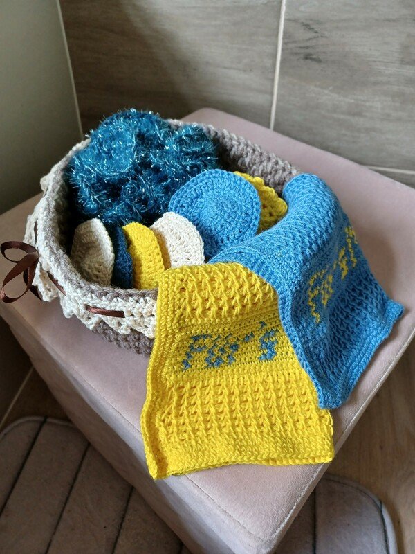 Das Körbchen hat einen Durchmesser von etwa 25 cm, die Waschlappen entsprechen einer handelsüblichen Größe.