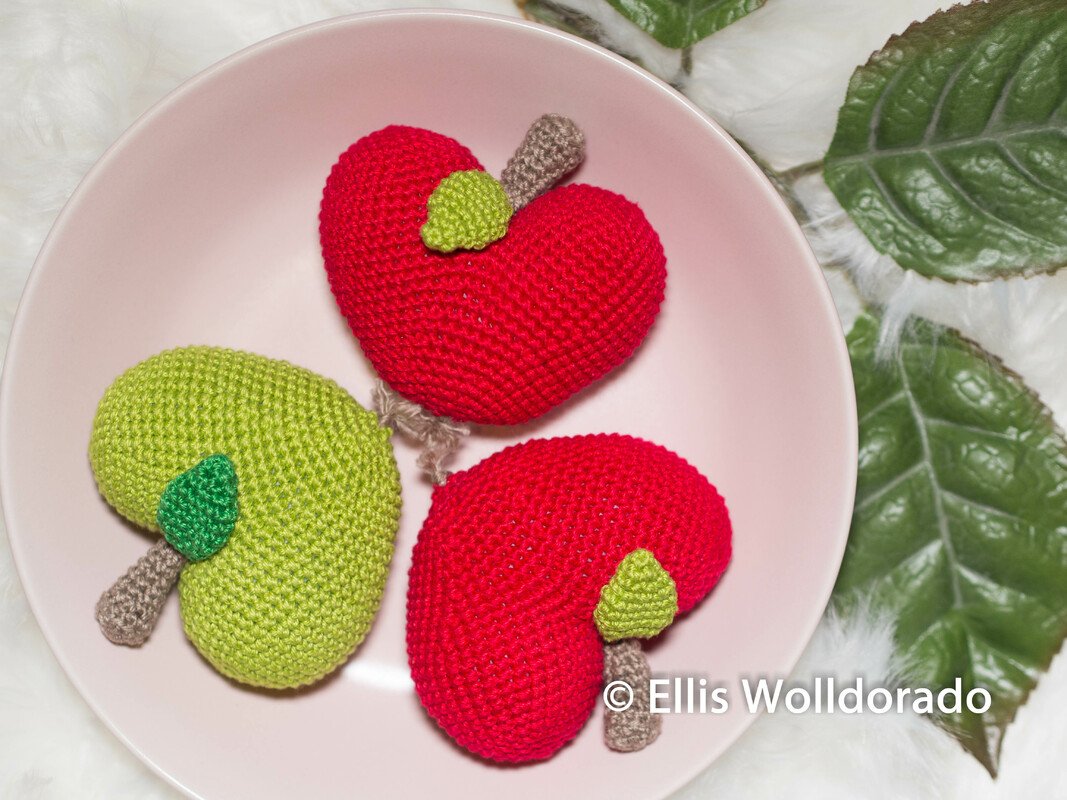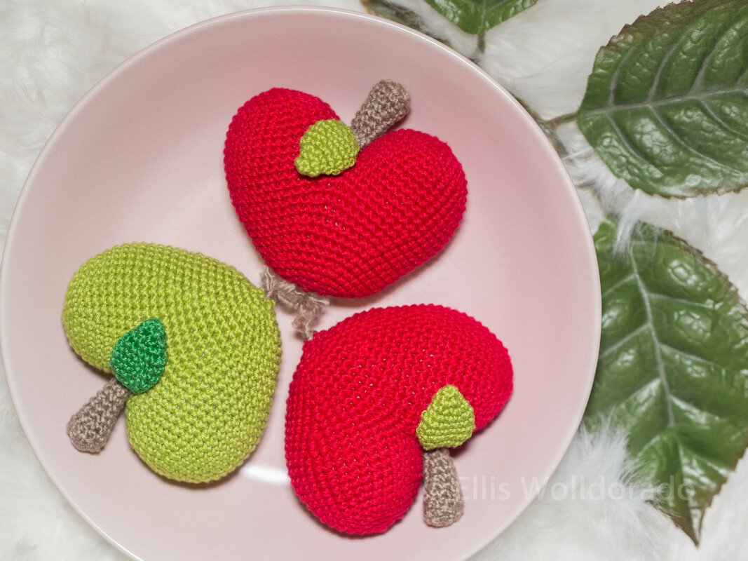 Mit Hilfe der hier erhältlichen Häkelanleitung (PDF-Datei) kannst Du die Herz-Äpfel ganz einfach nachhäkeln. Die Anleitung beinhaltet viele Bilder, die Dir das Nacharbeiten leicht machen. Du weißt zu jedem Zeitpunkt, wie Deine Häkelarbeit gerade aussehen sollte.