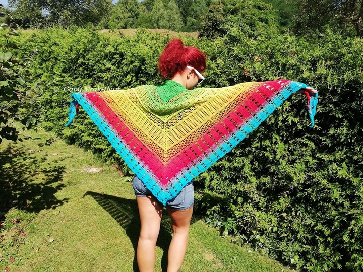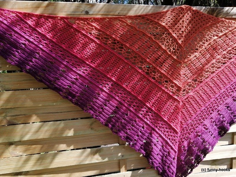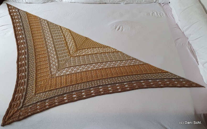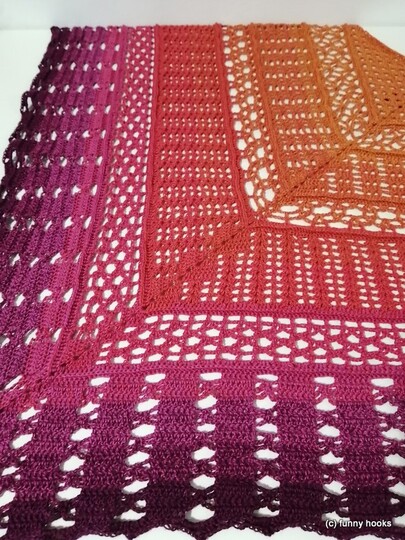 Die bunte Version wurde aus 1250m, 3 fädig von Bobbelmagic gearbeitet und ergab mit der gleichen NS eine Größe von 200 cm x 85 cm (ungespannt).
