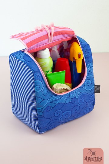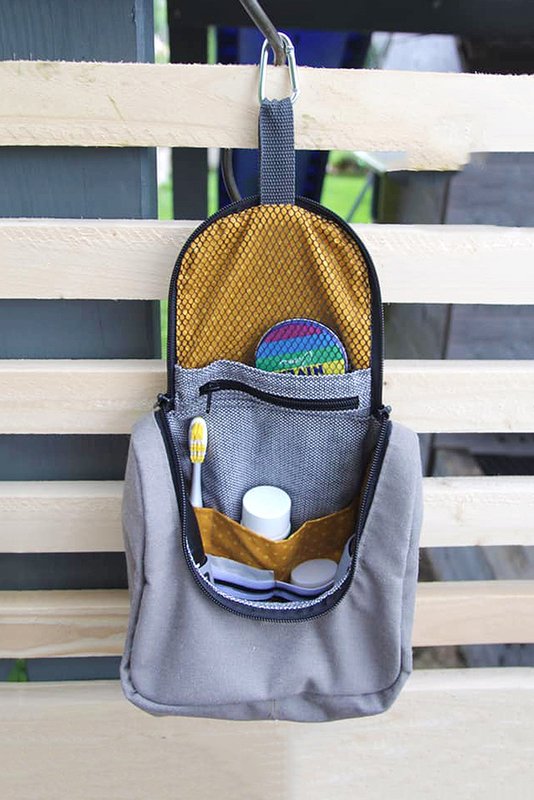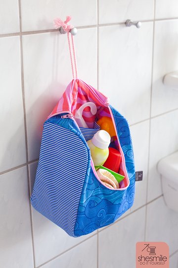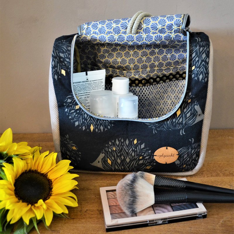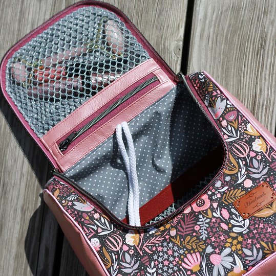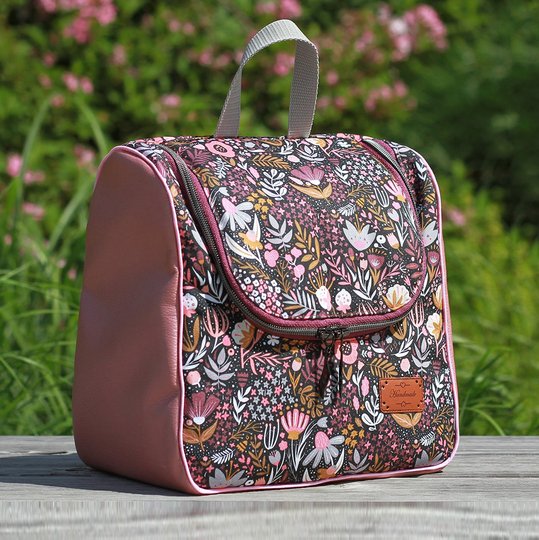 Über eine Schlaufe oder Bänder lässt sie sich im geschlossenen oder offenen Zustand ganz einfach aufhängen. Perfekt als Kulturtasche auf Reisen.