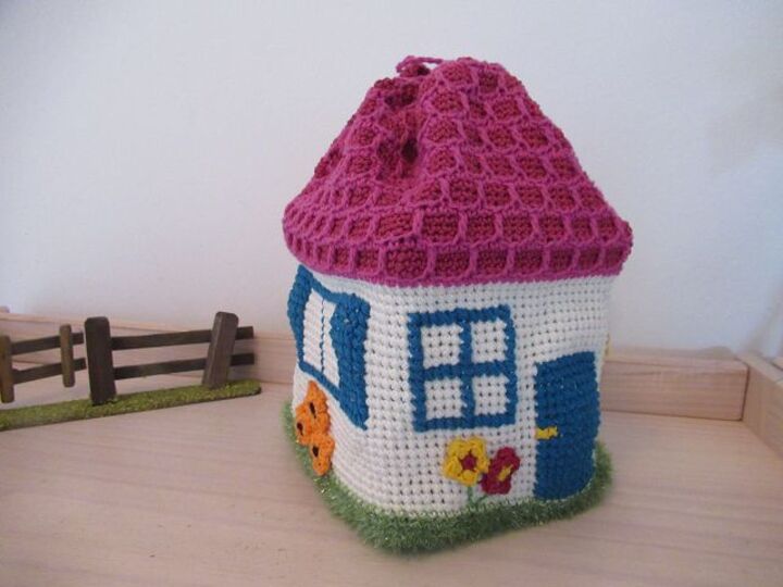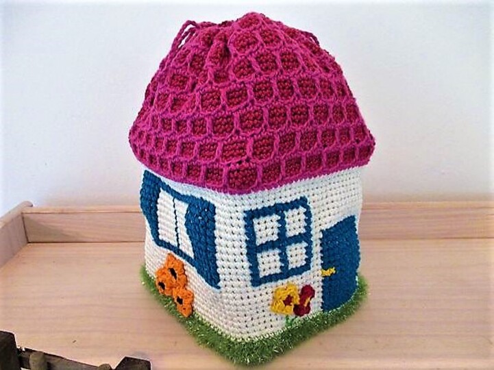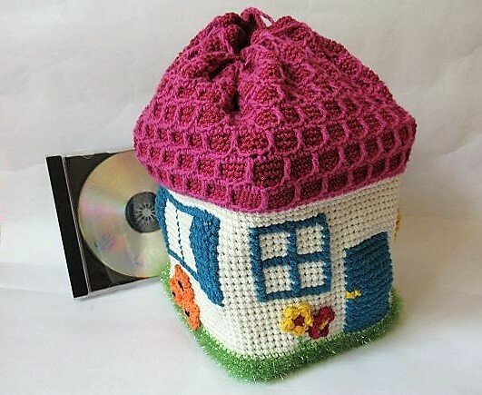 Das Haus wird etwa 14 cm breit, 14 cm lang und 24 cm hoch, kann aber in jeder beliebigen Größe gehäkelt werden. Es ist so groß, dass es sich gut als Aufbewahrung für CDs eignet.