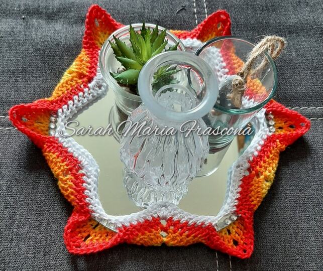 Man kann es als kleines Körbchen oder aber auch als Sternchen hinlegen. Ich habe eine kleine Glasplatte mit einem Dzrchmesser von ca. 18 cm reingelegt.