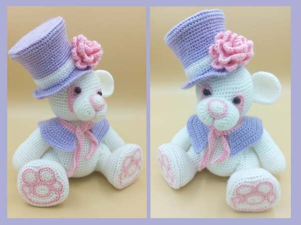 Ich habe Hamti den Bären mit Woll Butt Versailles und einer 2er Häkelnadel gehäkelt und er hat bei mir eine Größe von ca. 23 cm (mit Hut).