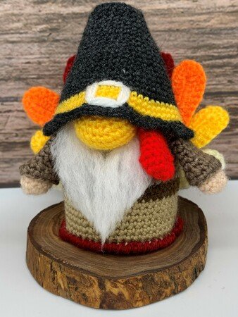 Mit dieser Anleitung kannst du einen herzigen kleinen Gnom häkeln, ideal für Thanksgiving, aber er wird dein Zuhause generell im Herbst verschönerin! Er hat einen kleinen Pilgerhut, und sich als Truthahn verkleidet.