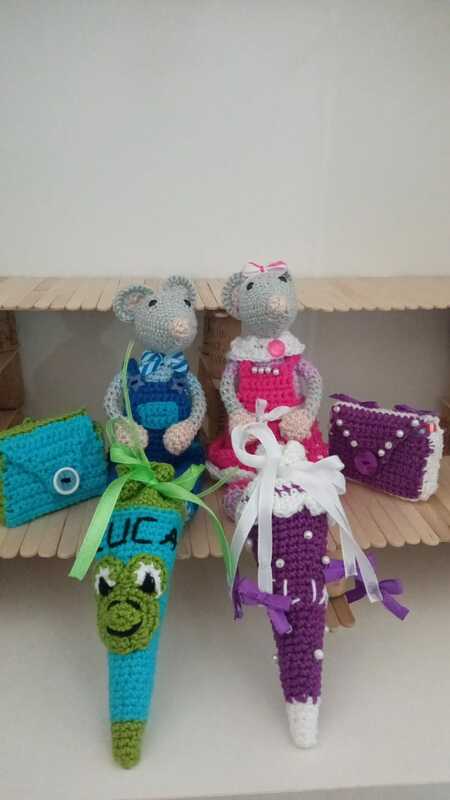 Hierbei handelt es sich um die Anleitung zum häkeln der Ratte, der Schultüte und der Schlutasche.