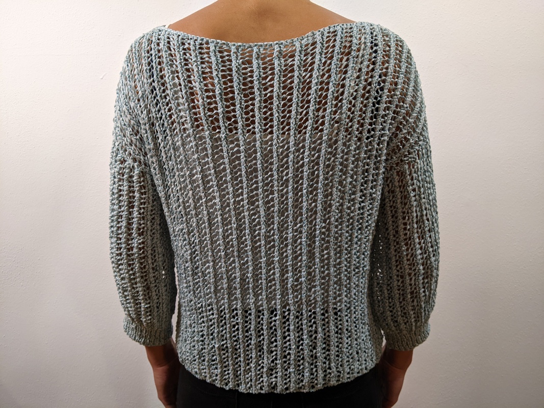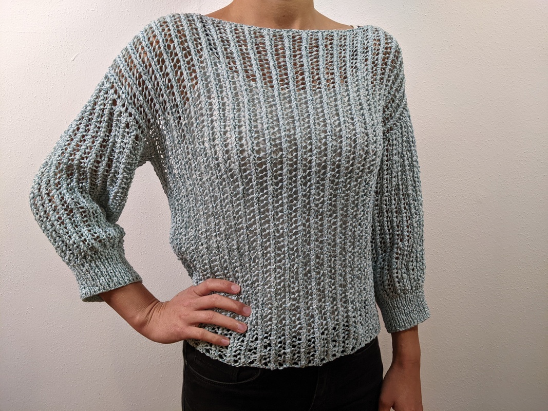 Durch den weiten Schnitt und die Dreiviertelarme ist der Pulli ideal von Frühjahr bis Herbst. Die Arme sind wie der Grundschnitt ebenfalls weit geschnitten und werden erst durch die Bündchen enger. Das verwendete Bändchengarn mit leichtem Glanzeffekt kommt durch das Lochmuster besonders gut zur Geltung und lässt sich vergleichsweise leicht stricken.