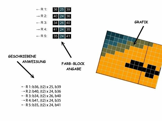 -farbige Zahlen-Blöcke für jede Reihe für feste Maschen (Stb od. hStb)