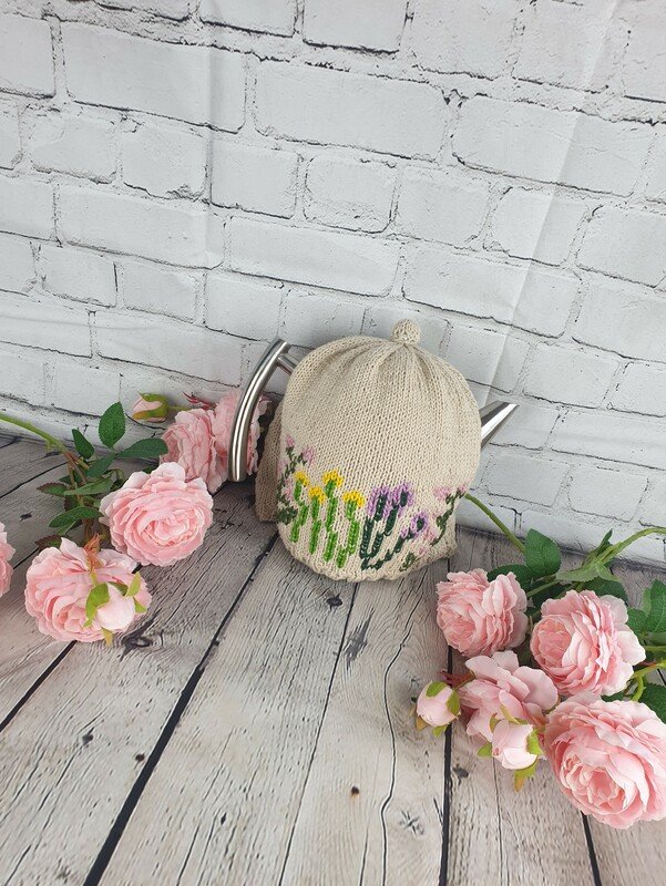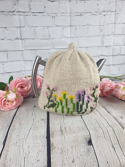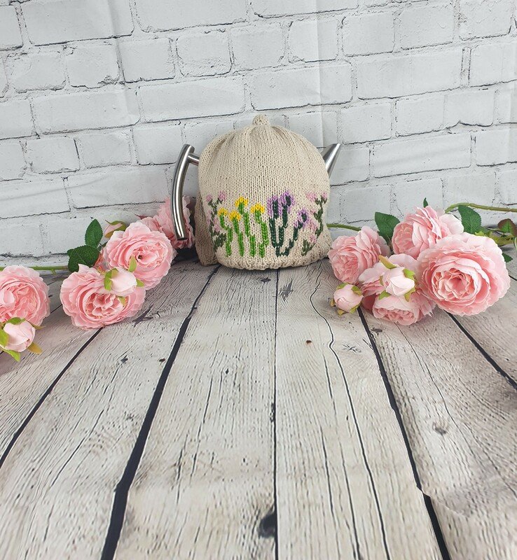 Dies ist eine Anleitung für einen superschönen Strickteekannenwärmer in 4 Grössen. Der Wärmer ist in 2 hälften gearbeitet bis die eine gegebene grösse erreichen und dann zusammengenommen und in Runden gefertigt. Das Blumenmuster ist dann mit Swiss Darning (Maschenstich) gearbeitet. Infos dazu sind in der Anleitung inklusive.