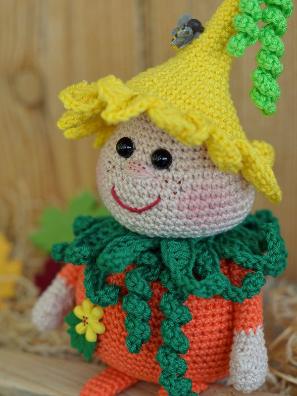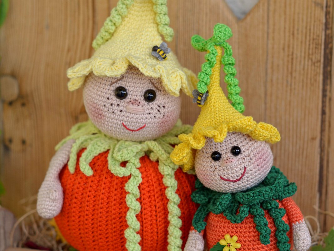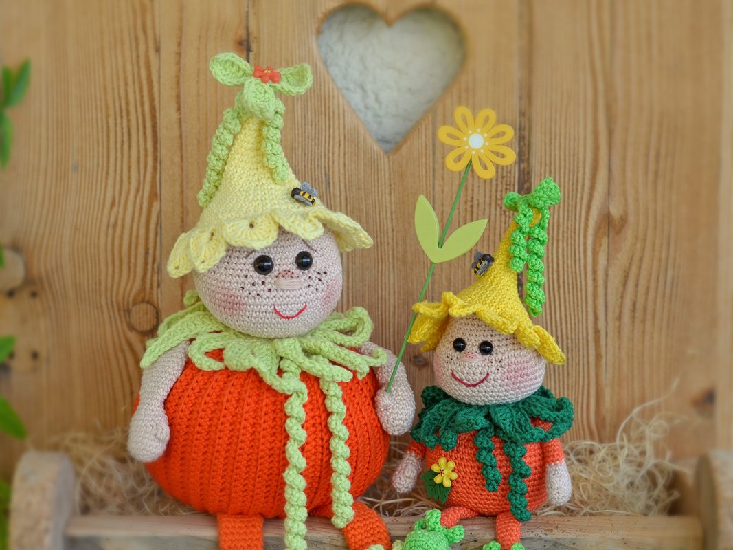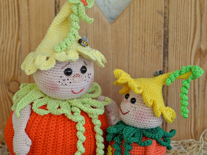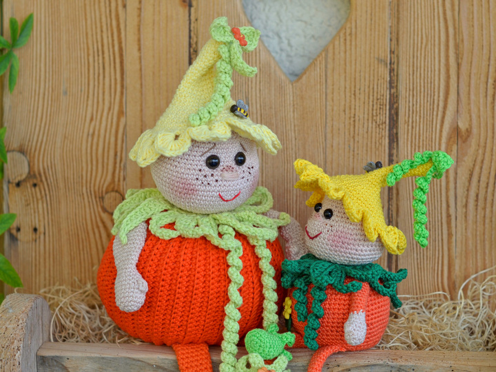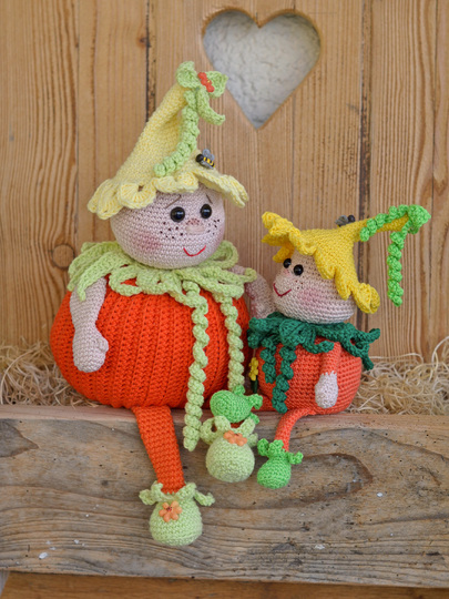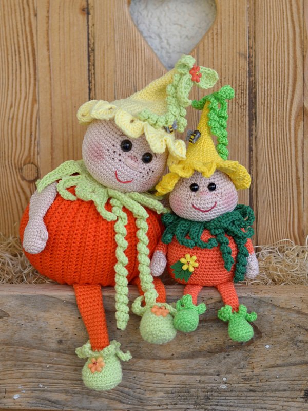 Bei Verwendung der angegebenen Wolle wird der kleine Bruder ca. 20 cm hoch (ohne Beine bis zur Mütze ) und der große Kürbis Karlchen ca 30 cm (ohne Beine).