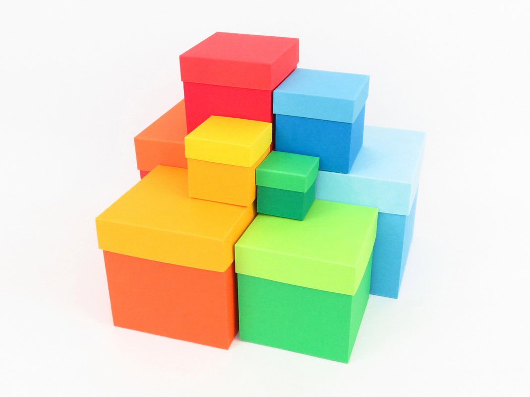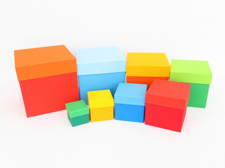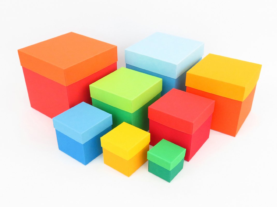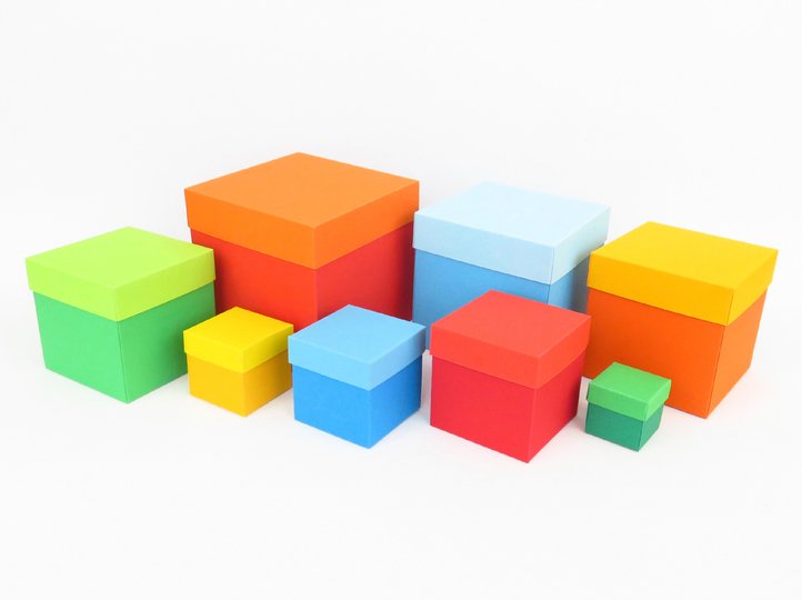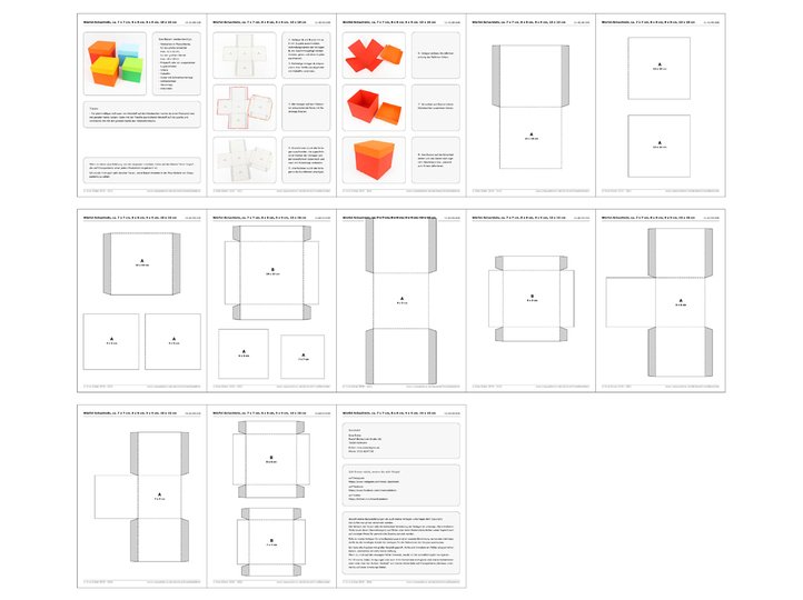 Mit dieser Anleitung bekommst du Vorlagen für Schachteln und jeweils dazu passende Deckel in acht Größen zwischen 3 x 3 cm und 10 x 10 cm. Mit diesen Vorlagen kannst du dir jederzeit Geschenkverpackung in Wunschfarben basteln und sie nach deinem Geschmack und passend zum Anlass dekorieren.