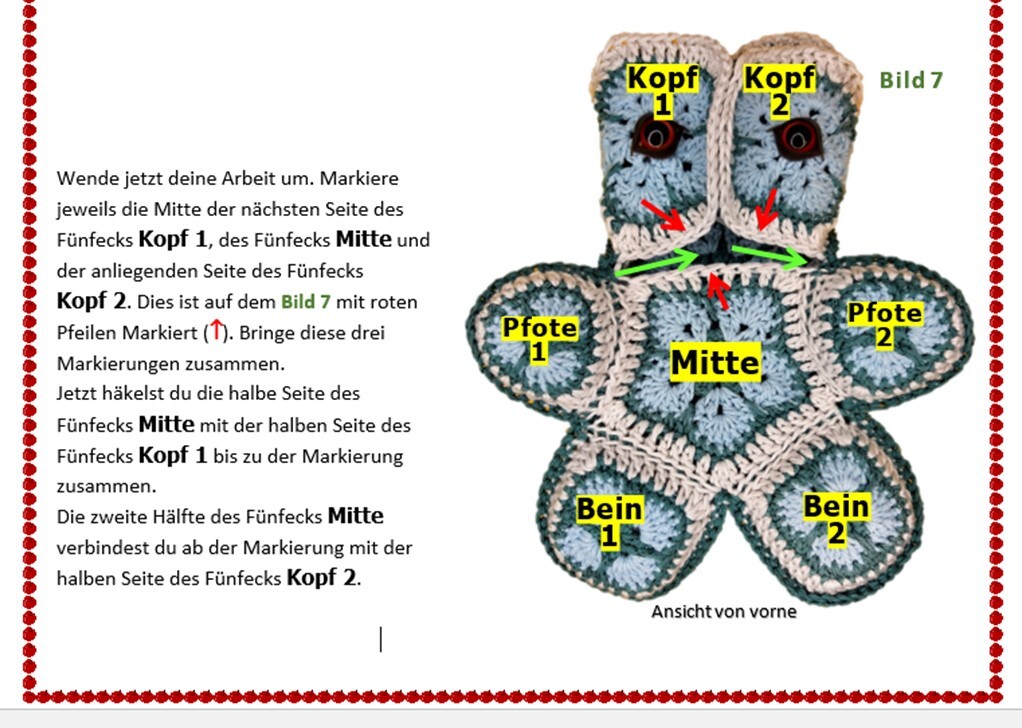 Du bekommst zwei PDF-Dokumente. Einen für die Erstellung der Blumen (22 Seiten). Einen zweiten für das Formen der Figur (14 Seiten). In dieser wird das Zusammenfügen der 23 Blumen ausführlich und mit Bildern beschrieben.