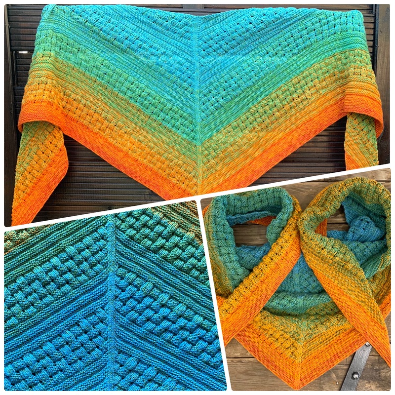 Das Tuch wurde mit 4-Fach Garn, NS 2,5 und 800 m LL gearbeitet. Das ergibt eine Spannweite von ca. 160 cm und eine Tiefe von ca. 45 cm. Das Muster ist erweiterbar und somit ist die Größe des Tuches ebenfalls erweiterbar.