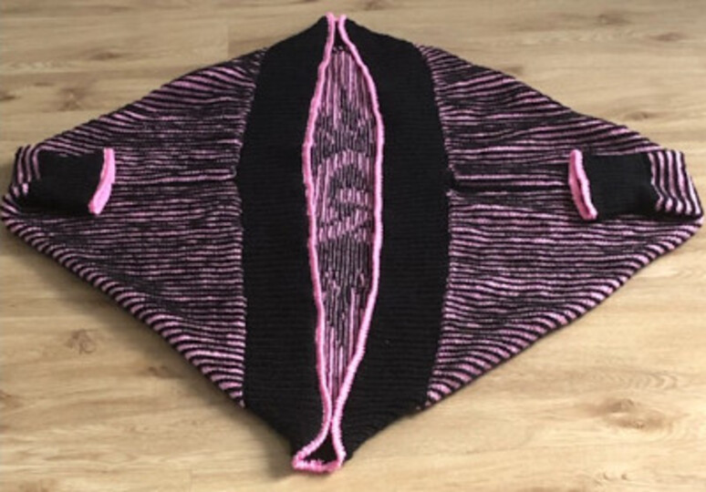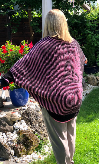Carmen hat ihren Seelenwärmer in Red Heart Bella gestrickt und Nadelstärke 4 verwendet. Sie brauchte 3 Knäuel in Schwarz und 2 Knäuel in farbig.