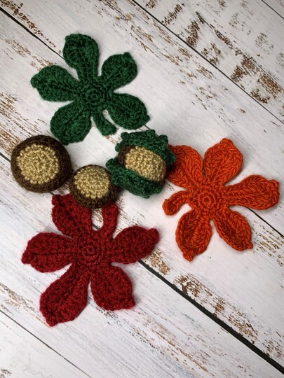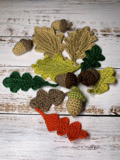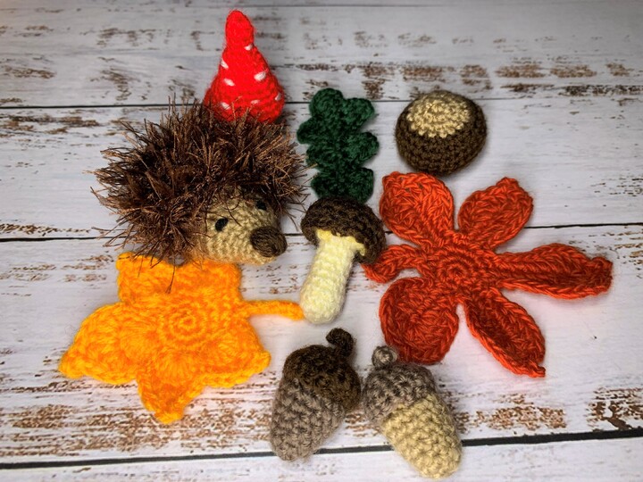 Diese Anleitung beinhaltet 21 verschiedene kleine Anleitungen, um dekorative und süße Herbstdekoration zu häkeln - Eichenblätter, Eicheln, Kürbisse, einen Igel, Fliegenpilze, Steinpilze, Kastanien, Kastanienblätter, eine Sonnenblume, Pinienzapfen...