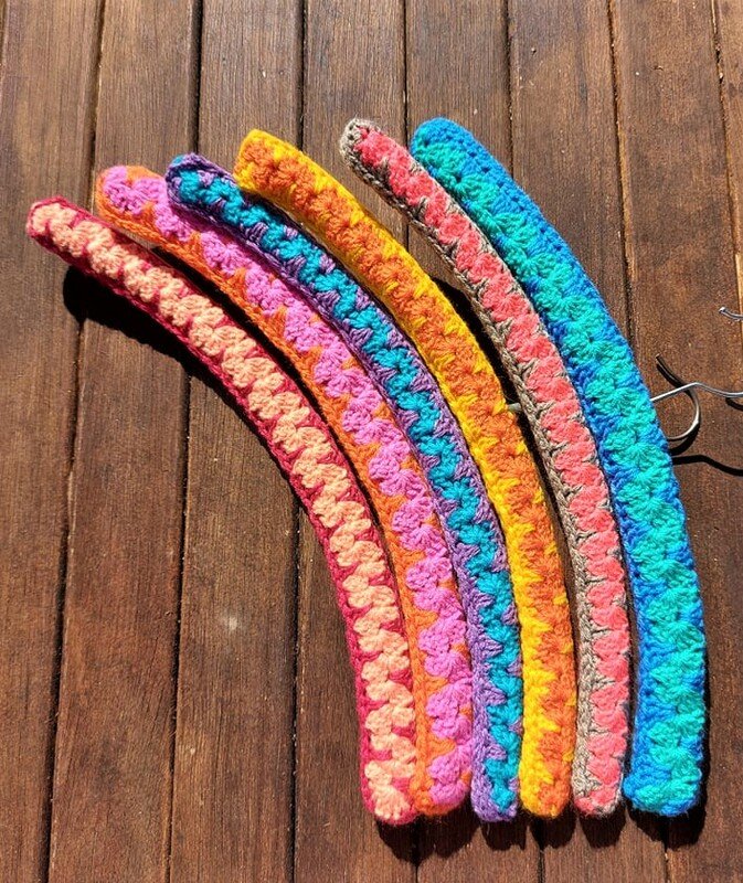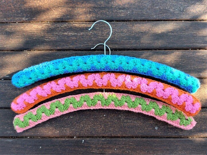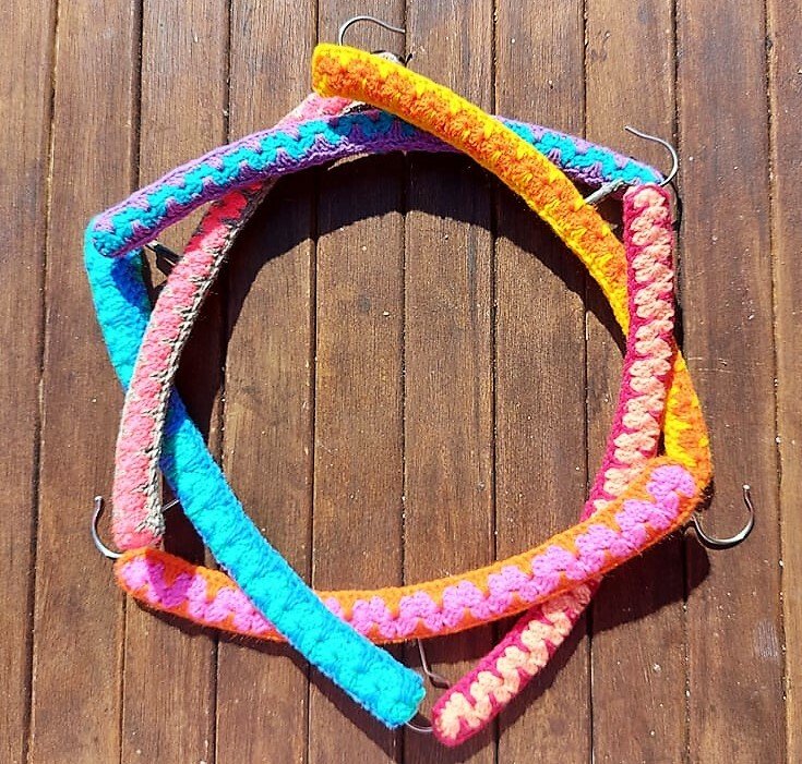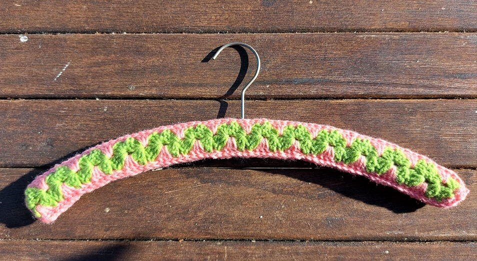 Vor etwa 30 Jahren hat mir meine Stief-Omi Anni zwei umhäkelte Kleiderbügel geschenkt. Ich liebe sie immer noch und finde sie unersetzlich um Strickjacken oder Häkel-Pullover darüber aufzuhängen. Bei allen anderen Bügeln bekommen diese unschöne Beulen an den Schultern oder rutschen vom Bügel. Daher mussten unbedingt noch ein paar mehr her. Hier nun meine Version in „Retro-Style“.