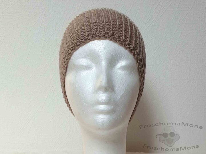 Ich stricke mit dir die Mütze als eng anliegende Mütze am Kopf.