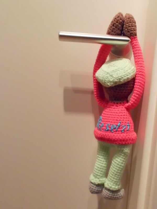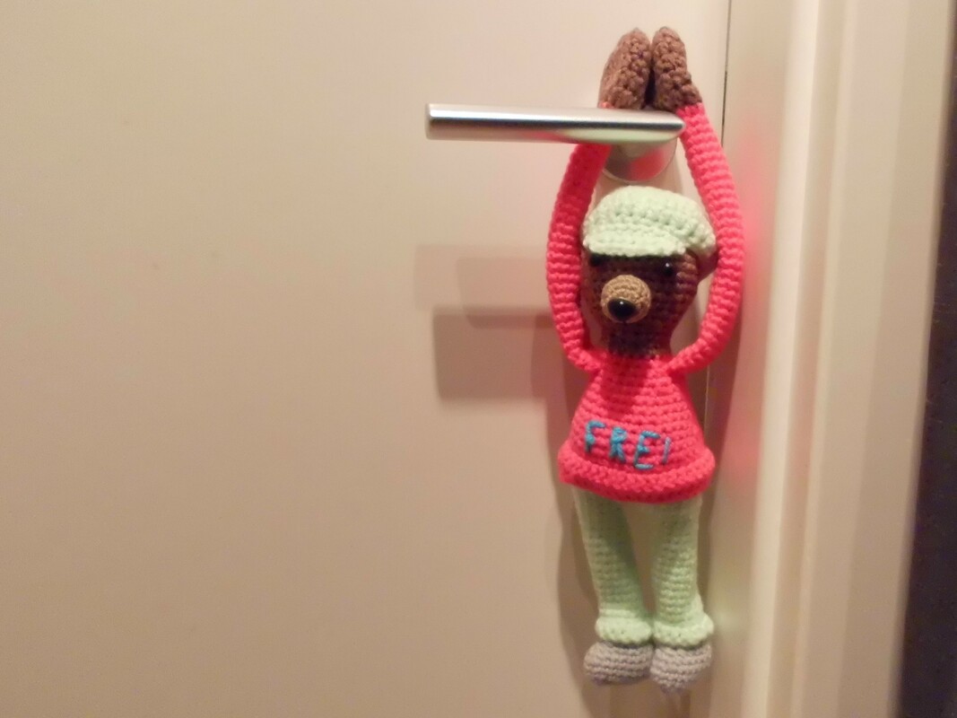 Gerade wenn Kinder im Haushalt leben,zieht man aus Sicherheitsgründen, den Schlüssel vom Bad heraus. Manchmal existiert auch gar kein Schlüssel mehr. Mit dem Hänge-Bärli kannst Du sehen ob das Örtchen ,,Besetzt" oder ,,Frei" ist. Einfach den Bär an die Türklinke hängen. Das Warten vor der Tür macht bei diesem Anblick doch richtig Spass, oder?