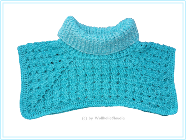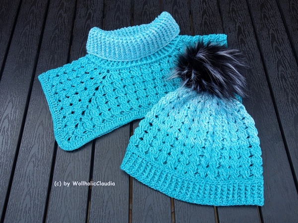 Dieses Set besteht aus einem Schalkragen, der auf 2 unterschiedlichen Arten getragen werden kann und der passenden Mütze. Der Schalkragen ist ohne Weiteres erweiterbar bis zum Poncho.