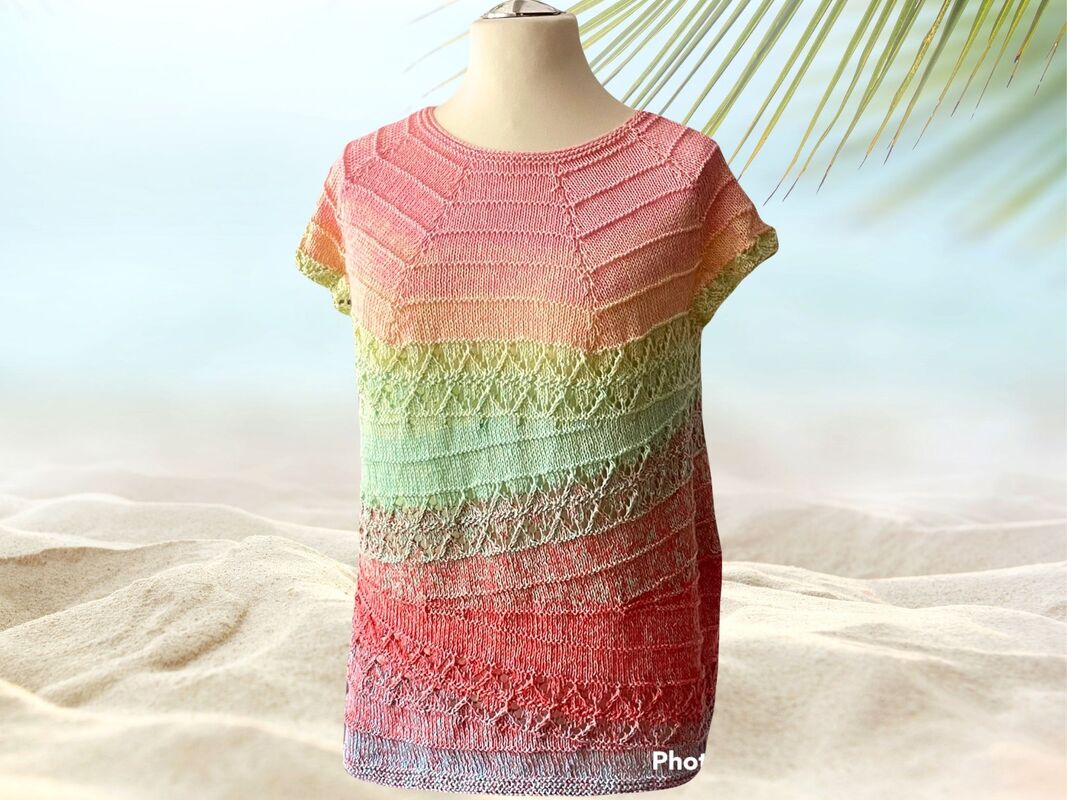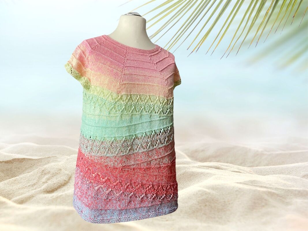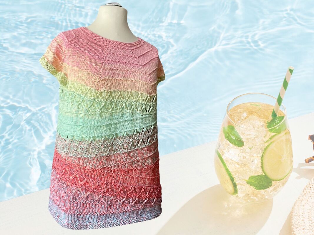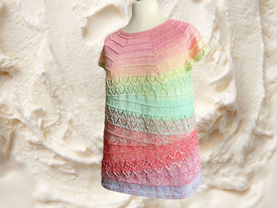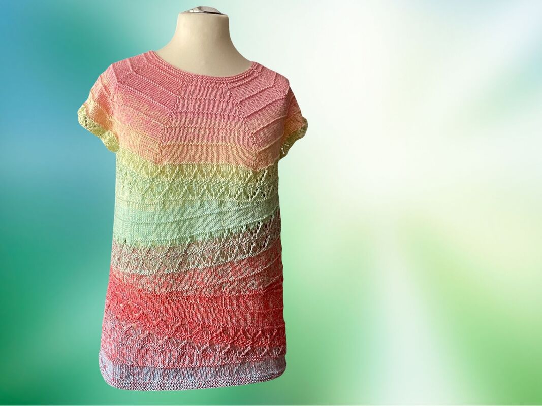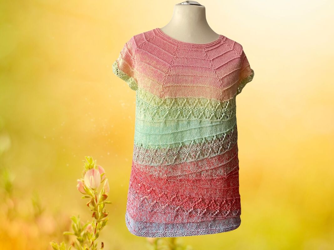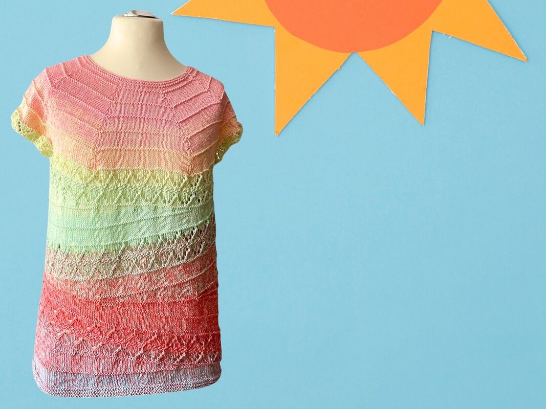 Diese Tunika ist mal was ganz anderes. Eigentlich in Runden gestrickt, aber unterbrochen mit verkürzten Reihen, lässt dein beues Shirt den Farbverlauf einmal ganz anders wirken. Probier es aus.