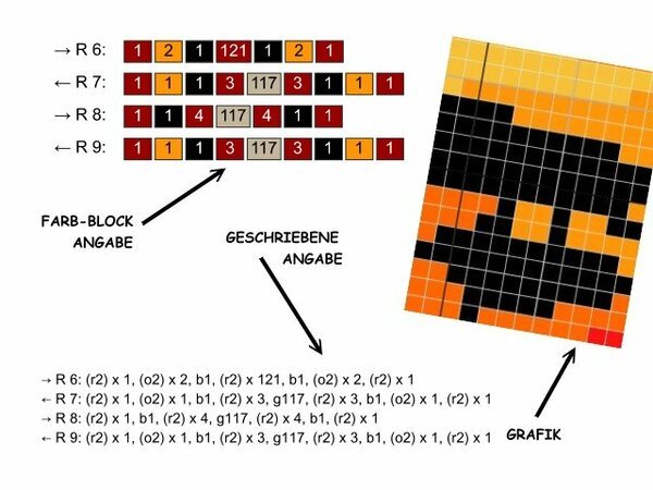 -farbige Zahlen-Blöcke für jede Reihe für feste Maschen (Stb od. hStb)