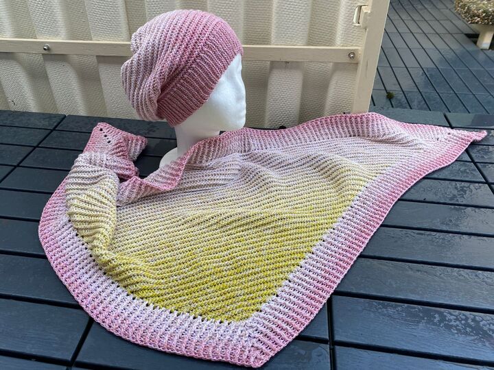 Das Tuch kann in jeder belieben Größe gearbeitet werden. Ich empfehle 4- bis 6-fädige Bobbel mit einer Lauflänge von 750 bis 1000 m.