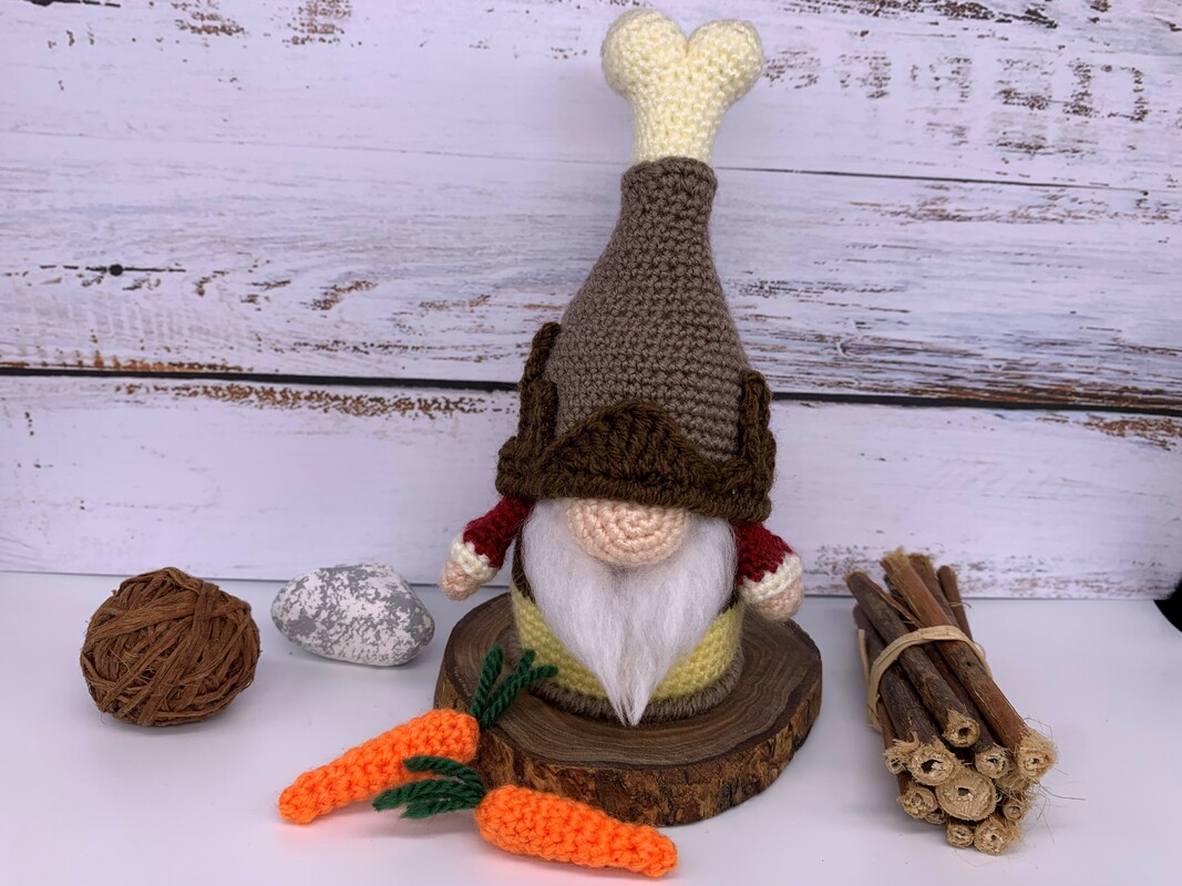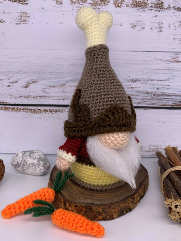 Mit dieser Anleitung kannst du einen lustigen kleinen Gnom häkeln, ideal für Thanksgiving, der beschlossen hat, dass man ein Truthahnbein auch mal als Mütze tragen kann! Zum Reinbeißen süß!