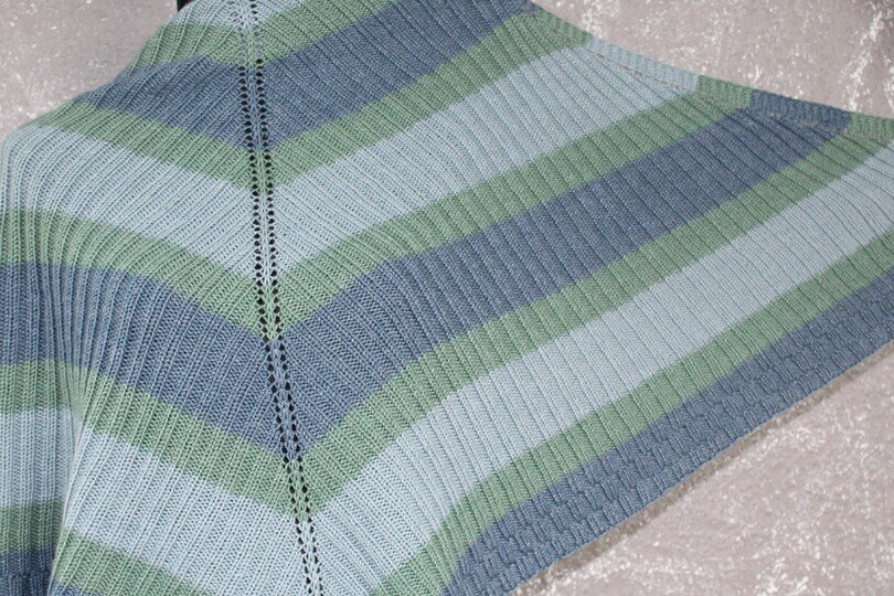 Das Tuch ist in einem einfachen Muster gestrickt, das seine besondere Wirkung durch den Wechsel verschieden breiter Farbböcke erhält. Es sind 3 verschiedene Farben, jeder kann seine Lieblingsfarben wählen.