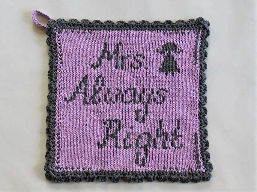 Bei einer Maschenprobe von 25 Maschen x 35 Reihen = 10 x 10 cm werden die Topflappen ca. 23 cm breit und 23,5 cm hoch, inklusive Umrandung.
