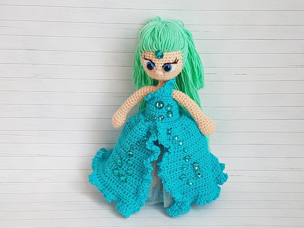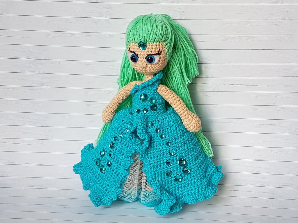 Nach Fertigstellung wird Enya ca. 24 cm groß (bei Verwendung der angegebenen Nadelgröße und Wollstärke).