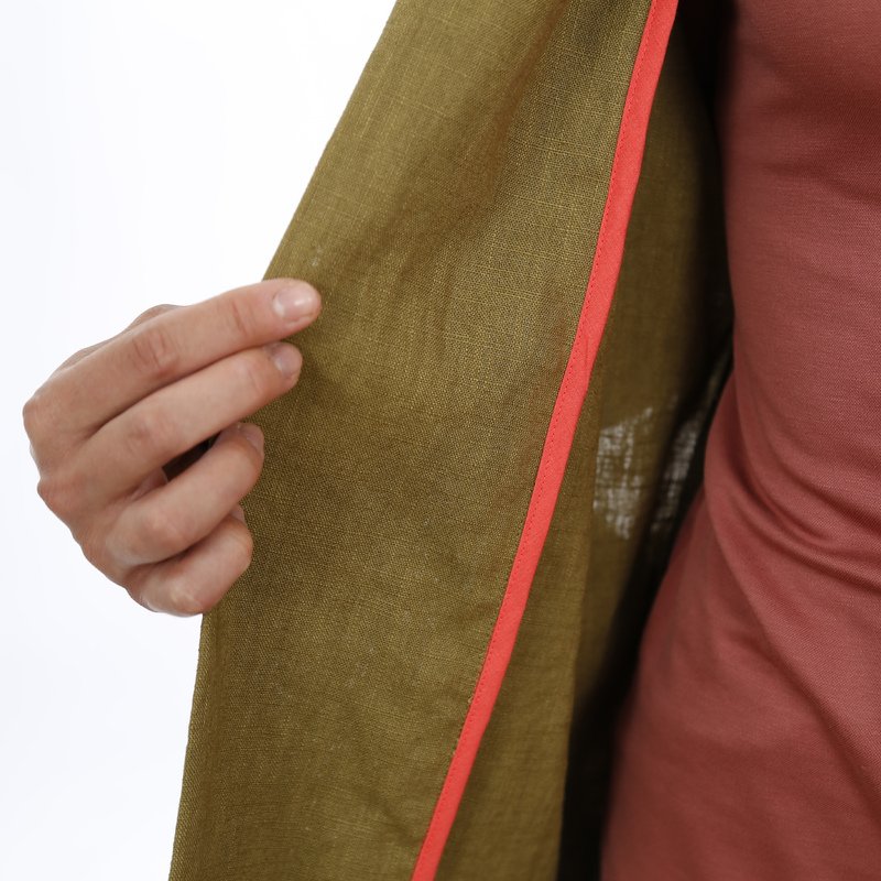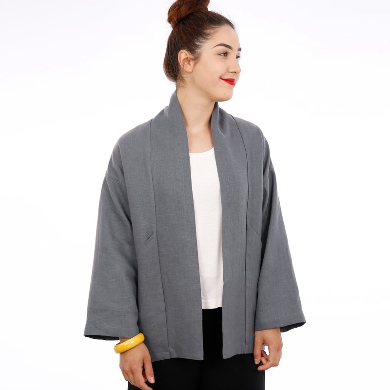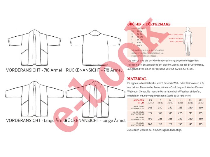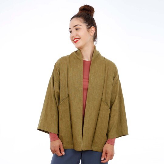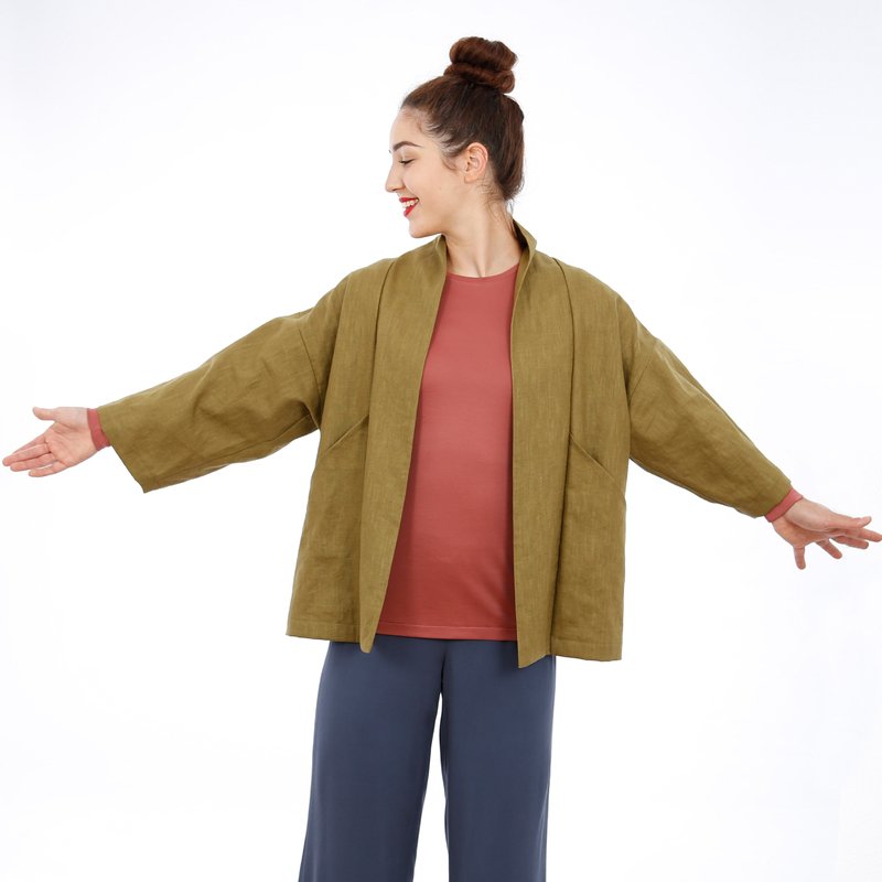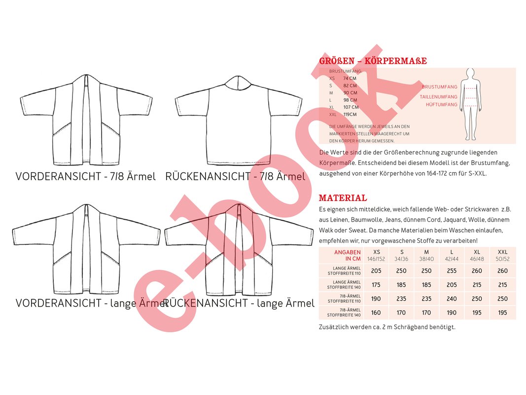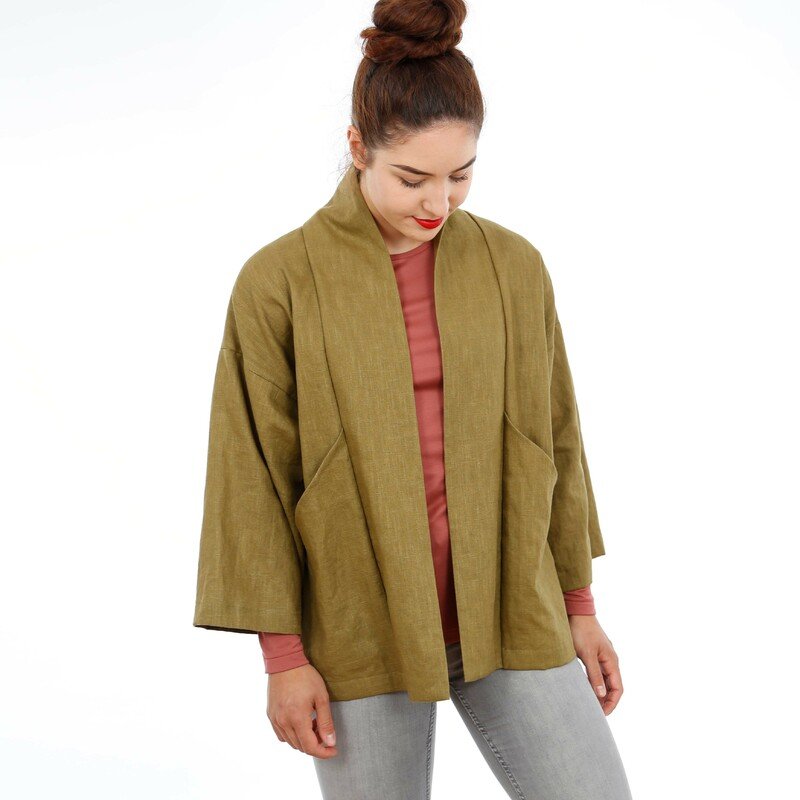 FRAU SINA ist die Jacke für alle, die auf schlichte, unkomplizierte Kleidung stehen. Der schnörkellose Schnitt besticht durch gerade Linien und den Verzicht auf alles Unnötige. Die Schultern sind lässig überschnitten, die weiten Ärmel können lang getragen oder auf 7/8-Länge gekürzt werden, der Schalkragen fasst gleichzeitig mit der Seitennaht die schrägen Taschen ein. Damit die verschlusslose Jacke auch von innen schön anzusehen ist, sind die Nahtzugaben des Kragens mit einem kleinen Bändchen versäubert, das gleichzeitig als kleiner Akzent in dem sonst so schlichten Teil genutzt werden kann.