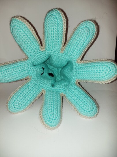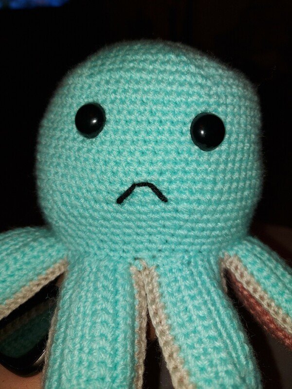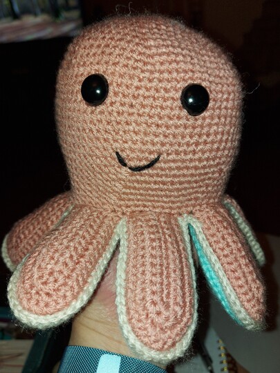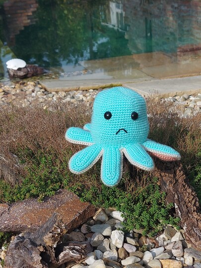 Mein Oktopus ist ca.12 cm hoch und hat eine Gesamtbreite ( mit Tentakeln ) von ca 24 cm.