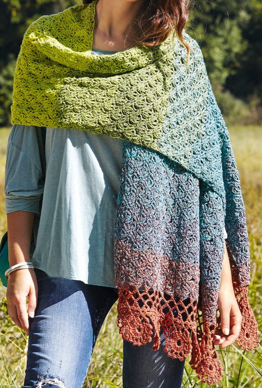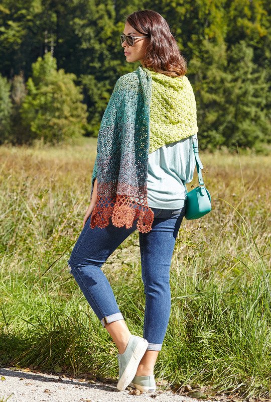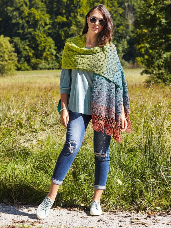 Die schönsten Regenbogenfarben sind in diesem Baumwoll-Wolle-Garn vereint. Das große Umschlagtuch wird mit zwei Bobbels gearbeitet und wiegt 400 g. Die sofort ins Auge fallende Spitzenborte wird mit dem Inneren der Bobbels gehäkelt. Für die erste Seite häkelst du die Borte und anschließend auf die Borte das Grundmuster. Für die 2. Seite häkelst du erst wieder mit dem Faden von innen die Borte. So ist gewährleistet, dass die Borten vom Farbverlauf her gleich sind. Nun kannst du mit dem äußeren Faden das Grundmuster fortsetzen und zum Schluss die Borte an der 2. Seite annähen. Das wunderschöne Garn von Lana Grossa wird mit Nadelstärke Nr 4 gehäkelt und hat, wenn es fertig ist, in etwa die Größe 44 x 190 cm.