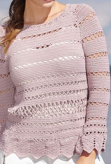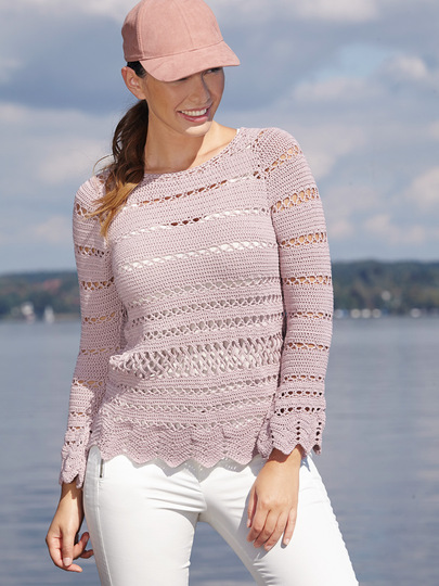 Was für ein toller, schmaler und kurzer Häkel-Pullover mit rundem Ausschnitt! Er geizt nicht mit Besonderheiten. Die Blenden, ein aus Stäbchen gehäkeltes Wellenmuster, gehen über in ein mit Lochreihen durchbrochenes Muster, das in halben Stäbchen gehäkelt wird. Vorder- und Rückenteil werden jeweils in zwei Teilen gehäkelt und zum Schluss mit einem aufwendigen Flechtmuster miteinander verbunden. Aber keine Angst, es ist genau beschrieben und so wird es bestimmt klappen. Die langen Ärmel, mit Volants an den Handgelenken, sind ansonsten relativ schmal. Für die Raglanschrägungen werden genau nach Anleitung einfach M unbehäkelt belassen. Da die Raglannähte im Fokus liegen, sollten sie gewissenhaft zusammengenäht werden. Das feine Wollgarn von LANGYARNS wird mit Nadelstärke Nr 3,5 gehäkelt.
