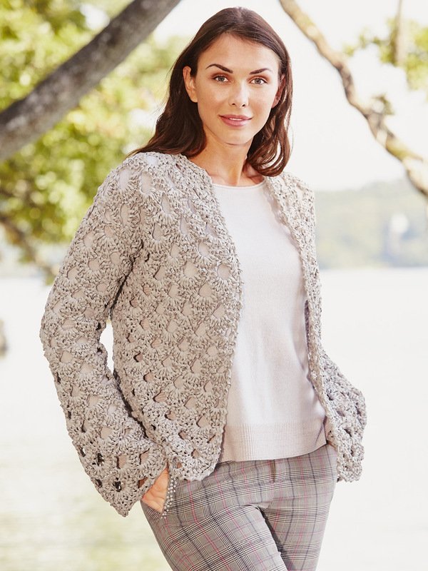 Schlicht und ergreifend ist diese Häkel-Jacke. Vorderteile, Rückenteil und die langen Ärmel werden von oben nach unten gearbeitet. Das Beste daran: alle Teile werden ganz gerade ohne Zu- oder Abnahmen gehäkelt. Das interessante Ajourmuster in Bogenform entsteht durch Luftmaschenbögen, die mit Stäbchen umhäkelt werden. Dank des neutralen Farbtons ist die Jacke vielseitig tragbar und wird bestimmt ganz schnell das neue Lieblingsstück. Da das ausgefallene Garn von Lana Grossa mit Nadelstärke Nr 7 gehäkelt wird ist die Jacke ganz schnell fertiggestellt.