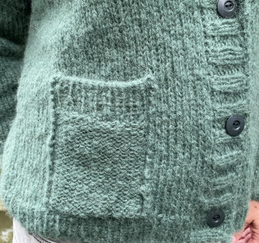 Die Jacke mit V-Ausschnitt wird dreifädig von unten nach oben gestrickt und später zusammengenäht. Rumpf und Ärmel werden separat in Reihen gefertigt. Die Schulterpasse wird mit der Methode der I-Cord Maschen entlang vom Rückenteil angestrickt. Die Taschen werden separat gefertigt und dann erst mit einem Matratzenstich und einem Maschenstich aufgenäht. Zuletzt werden die Maschen entlang der Vorderkanten, an der Schulterblende und am rückwärtigen Halsausschnitt aufgenommen. Die Blende wird im Rippenmuster incl. Knopflöcher angestrickt.