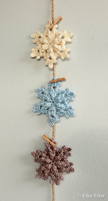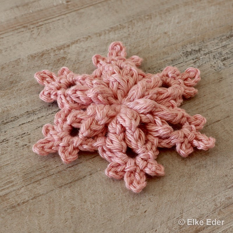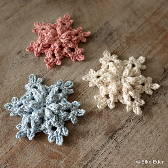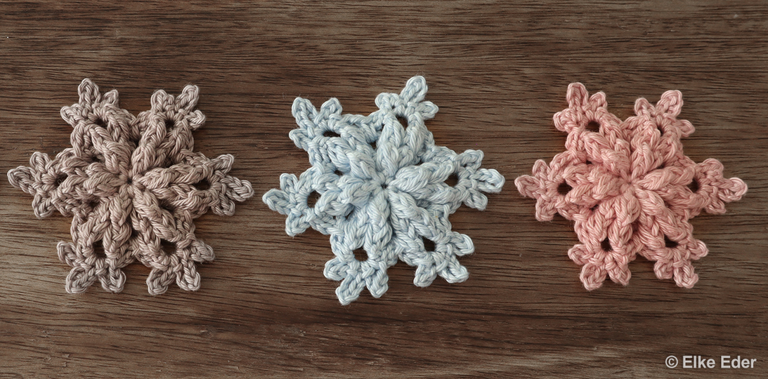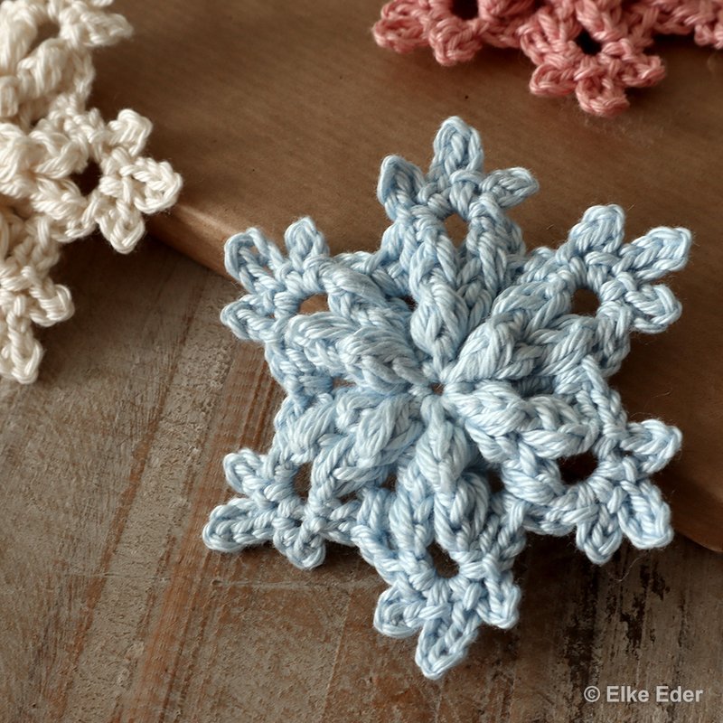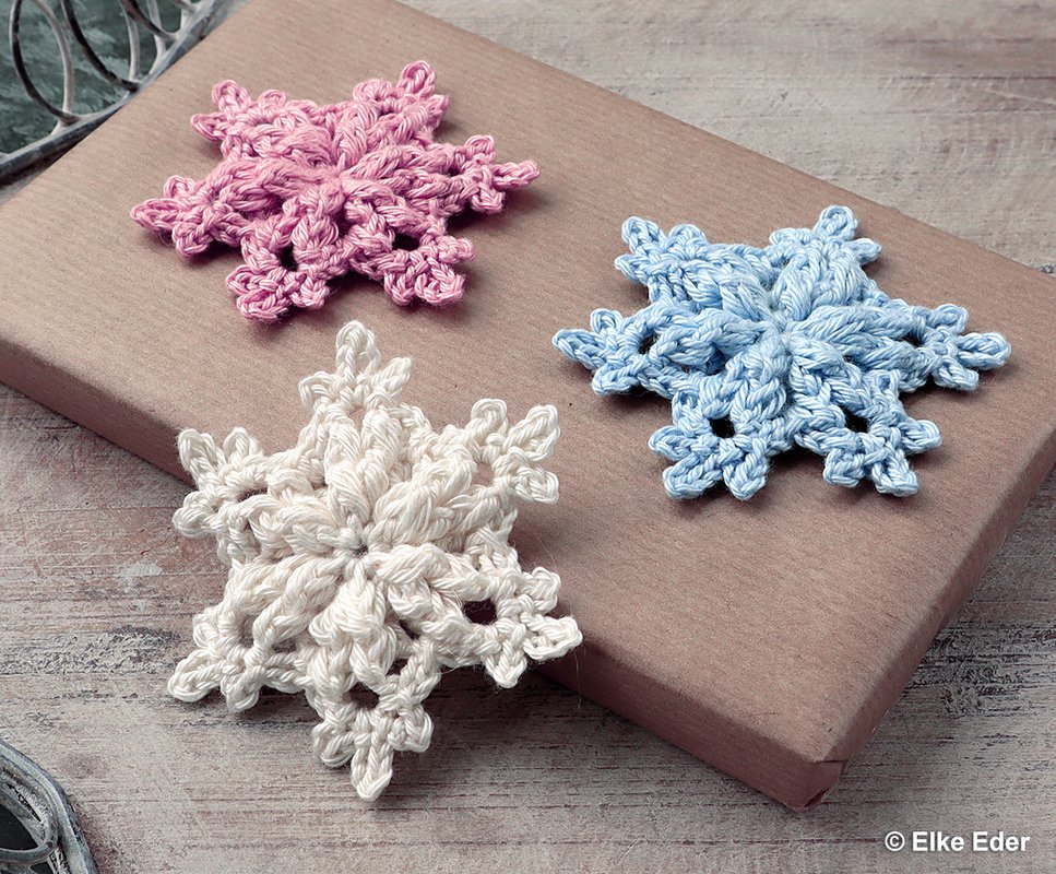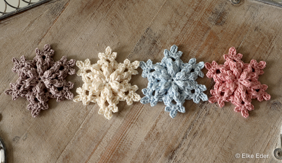 Ein schönes Reliefmuster, vier Runden und etwas Häkelerfahrung benötigt es um im Handumdrehen diese zauberhafte und vielfältige Winterdeko entstehen zu lassen.