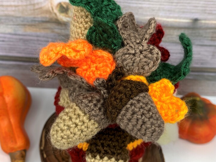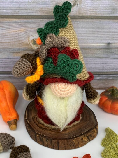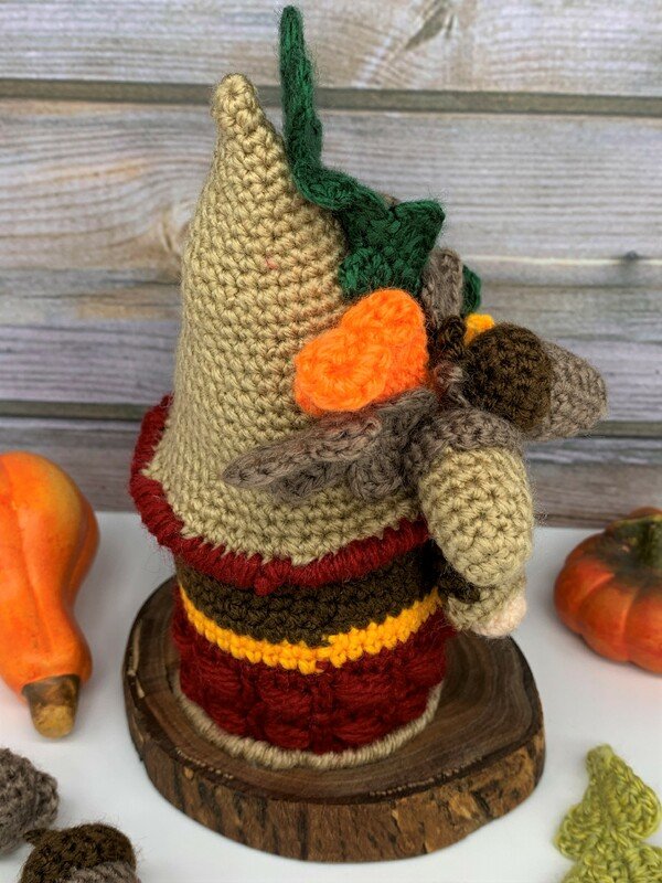 Mit dieser Anleitung kannst du einen entzückenden Herbstgnom in Herbstfarben häkeln, der Eichenlaub und Eicheln am Hut hat. Und als Bonus wird er von einem kleinen süßen Igel begleitet.