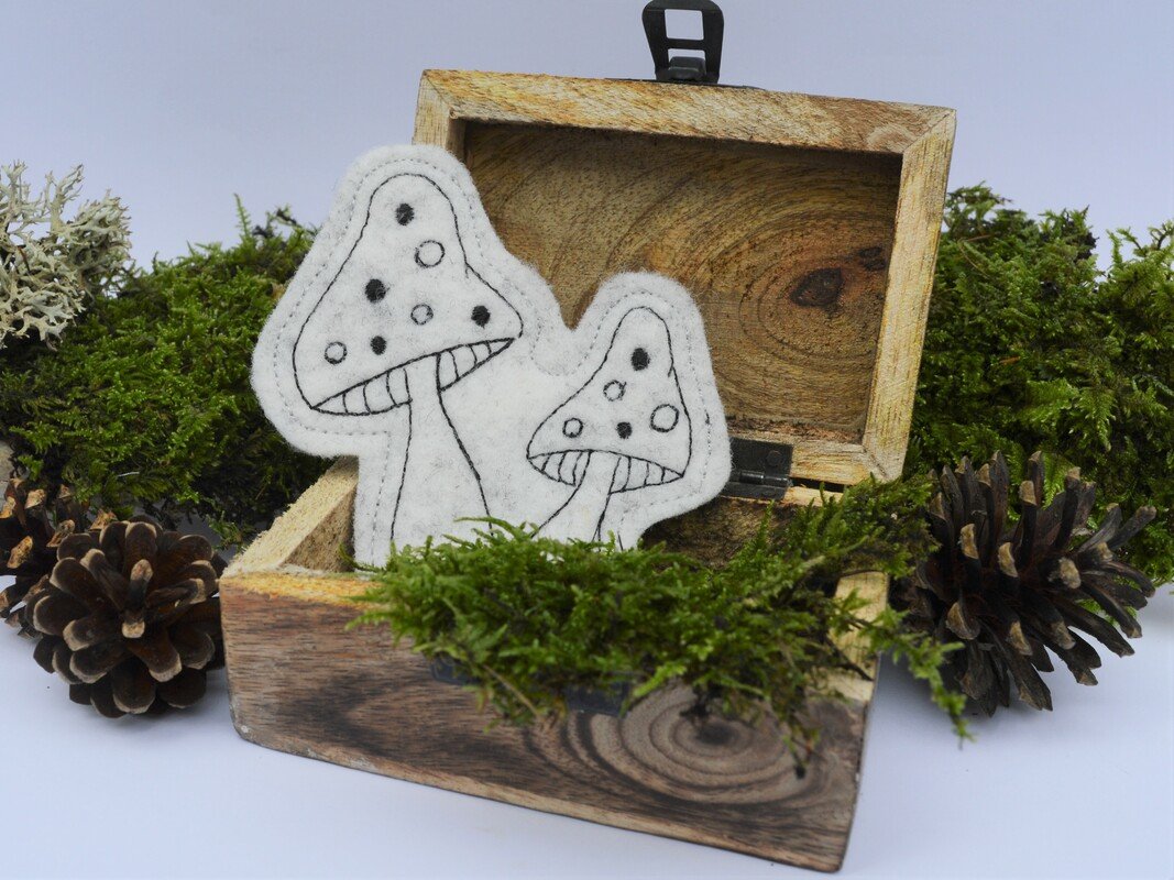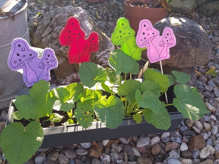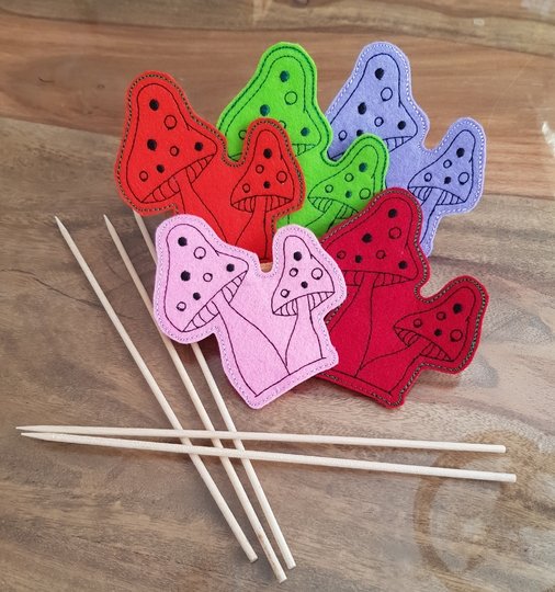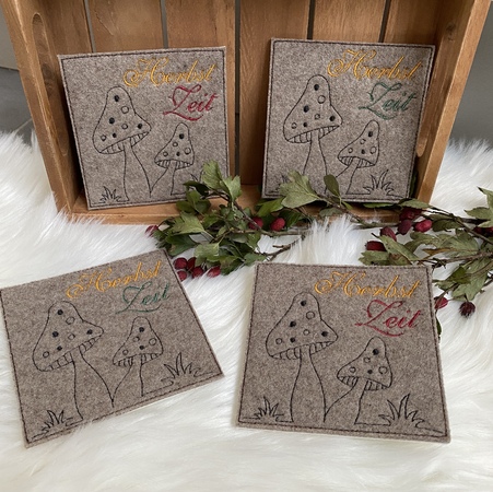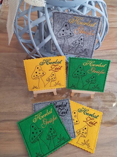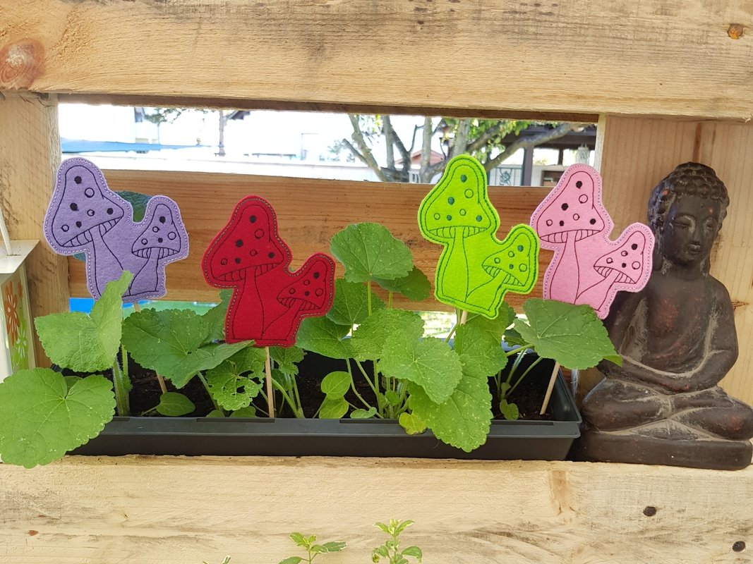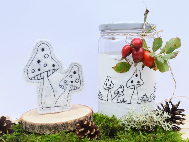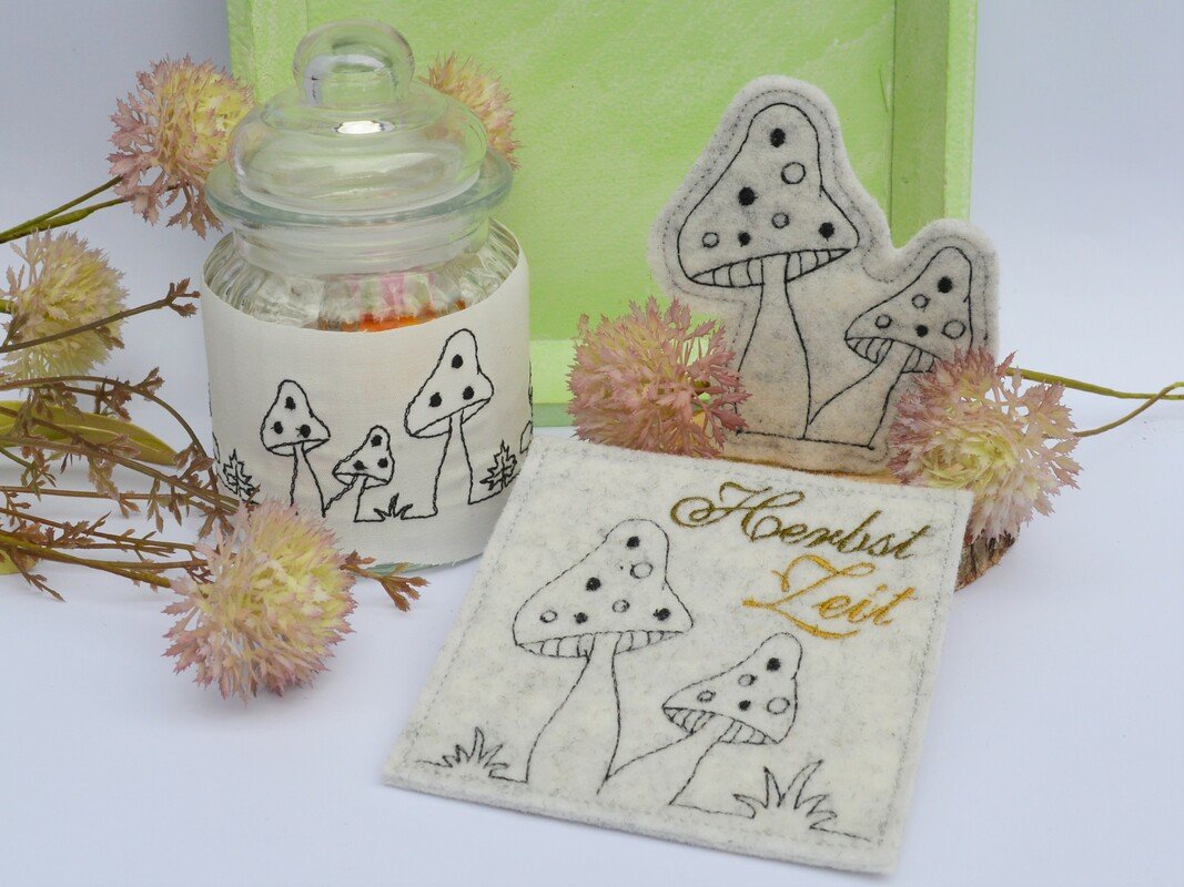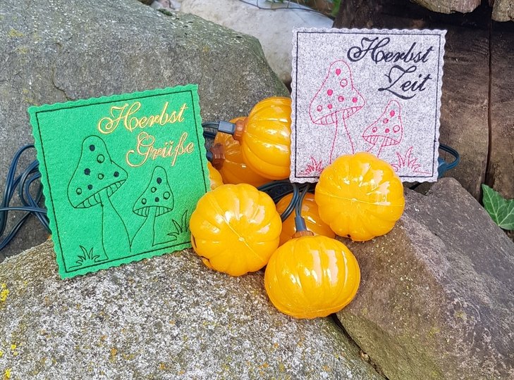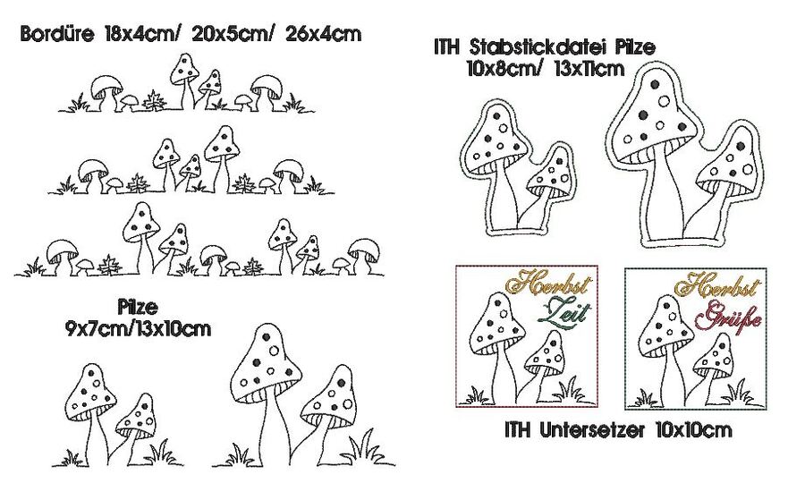 Hier nun ein SET für den Herbst mit Pilzen: zum einen eine Bordüre, die auf Windlichter, Platzsets,... gestickt werden können. Daz die Pilze in 2erlei Größen und als ITH Stickdatei, um sie auf einen Stab oder Spieß aufstecken zu können. So dekorieren sie Blumentöpfe oder die Fensterbank im Herbst.