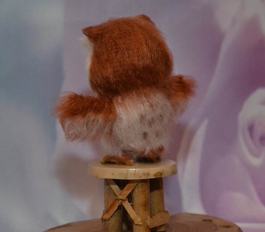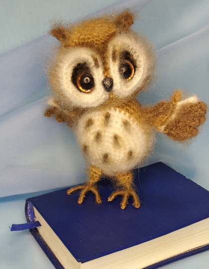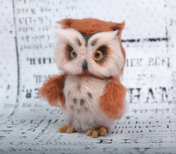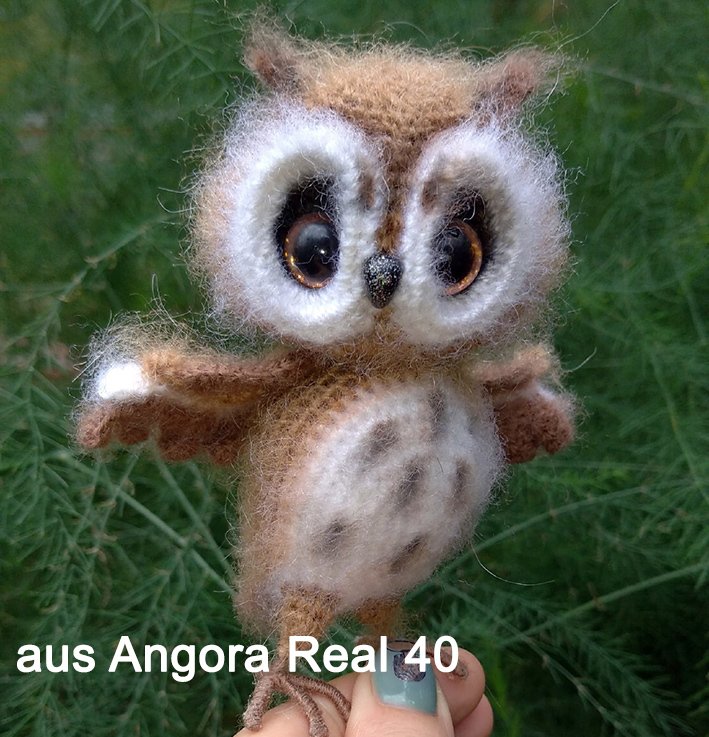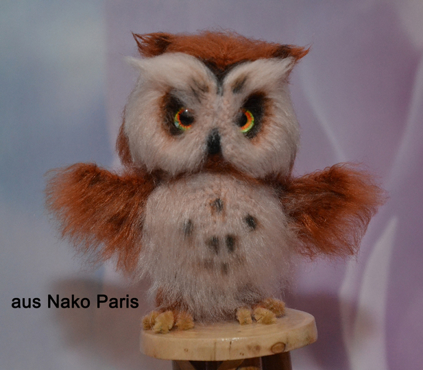 Eule. Sie steht allein, die Pfoten haben Drahtgerüst. Kann den Kopf in alle Richtungen drehen, hat bewegliche Befestigung. Schnabel aus Modelliermasse. Eine Variante des gestickten Schnabels ist in der Anleitung vorhanden.