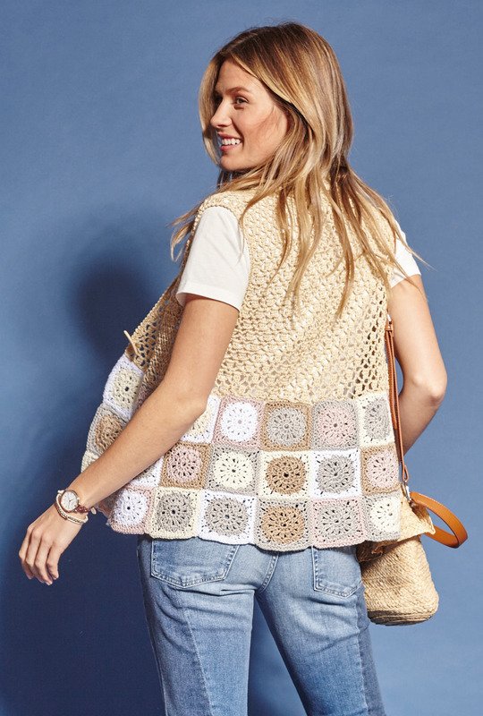 Genau das richtige für den Sommer ist diese Weste! Ob über einem T-Shirt, Kleid oder am Strand über dem Bikini getragen, mit ihr fällst du immer auf. Für sie häkelst du erst im einfachen Muster mit halben Stäbchen die oberen Westenteile. Dann arbeitest du 42 (45) Grannys, je nach Weite. Diese kannst du dann zusammenhäkeln oder -nähen, ganz wie es dir lieber ist. Für den schönen Umschlagkragen schließt du nur die hintere Mitte und nähst ihn in den hinteren Ausschnitt. Das Baumwollgarn von Lana Grossa gibt es noch in vielen anderen Farben. Du häkelst es mit Nadelstärke Nr 4 und 5 und kannst die Weste in den Größe 36, 38, 40 und 42 nacharbeiten.
