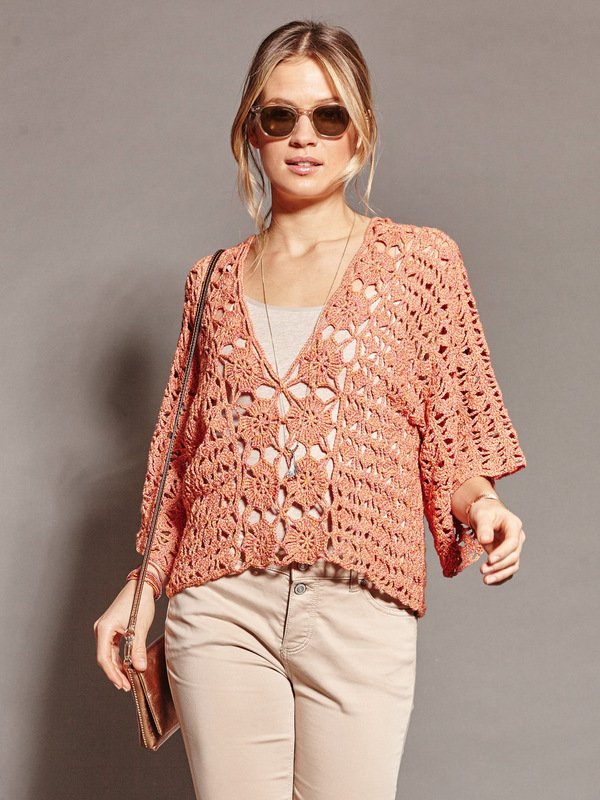 Besonders ausgefeilt sind die Muster und der Schnitt dieses kurzen Häkel-Pullis. Zunächst werden die Grannys, die an den Luftmaschenbögen miteinander verbunden sind, gehäkelt. Du solltest unbedingt darauf achten, dass du in Höhe des Ausschnittes die Grannys in der Mitte nicht miteinander verbindest. Anschließend wird seitlich, an die Längskanten des Granny-Streifens, das jeweilige Vorder- Rückenteil mit den kurzen Ärmeln in T-Form angehäkelt. Durch Luftmaschenketten ist das Muster recht luftig. Das Baumwoll-Mischgarn von Wool Butt häkelst du mit Nadelstärke Nr 3,5. Den Pulli kannst du in den Größen 36, 38, 40, 42, 44 und 46 arbeiten.
