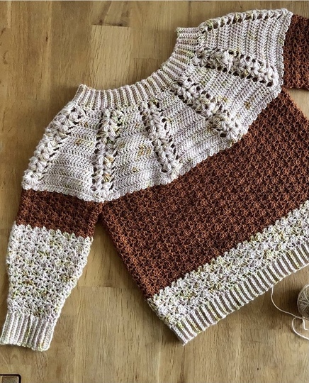 Der Pullover wird RVO von oben nach unten, beginnend mit einer Rundpasse, in einem Stück gehäkelt. Dadurch entfällt das Zusammennähen von Einzelteilen.
