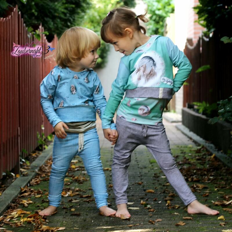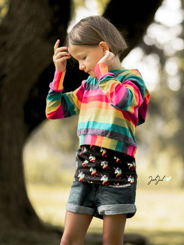 Gr. 98 – 164 findest du in Einzelgrößen in dieser Datei – nähbar ist das Unterzieh-Shirt idealerweise aus Jersey. Das Crop Top kannst du aus Jersey oder gut dehnbarem Sommersweat nähen. Fürs Unterzieh-Top benötigst du keine weiteren Stoffarten; fürs CropTop wird Bündchenstoff benötigt.