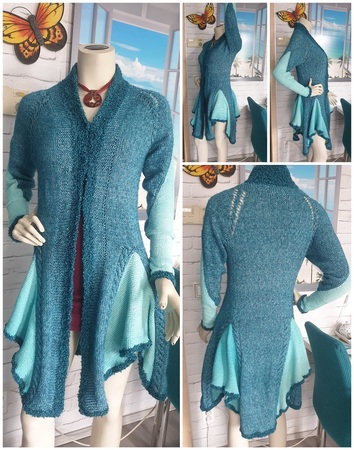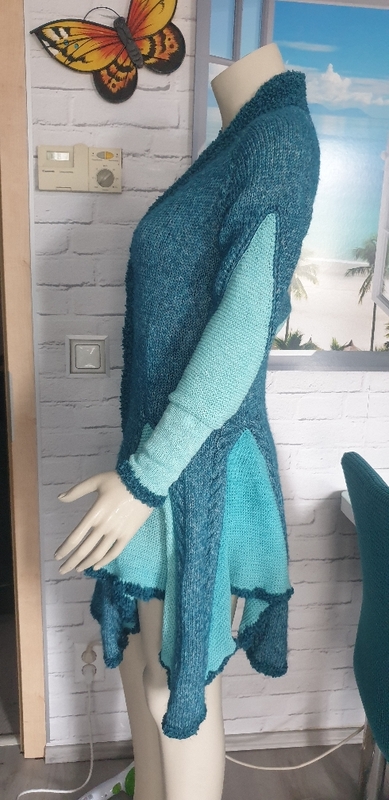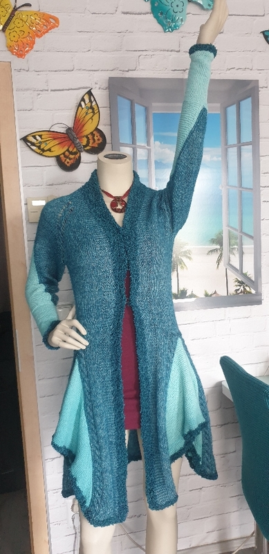 Ein elegant, beschwingter Mantel mit raffiniertem Zopfmuster und farblich abgesetzten Einsätzen ab der Taille und an den Ärmeln, der alle Blicke auf sich ziehen wird.