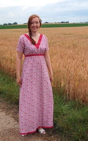 Es hat auch lange Ärmel verpasst bekommen, damit es später auch im Herbst/Winter zum Einsatz kommen kann. Die Taille kann mit einem Gummiband zusammengehalten werden, was den eventuellen Ansatz eines Bäuchleins verschwinden lässt. Der V-Ausschnitt und die angeschnittenen Ärmel geben dem Kleidchen eine lässige Note.