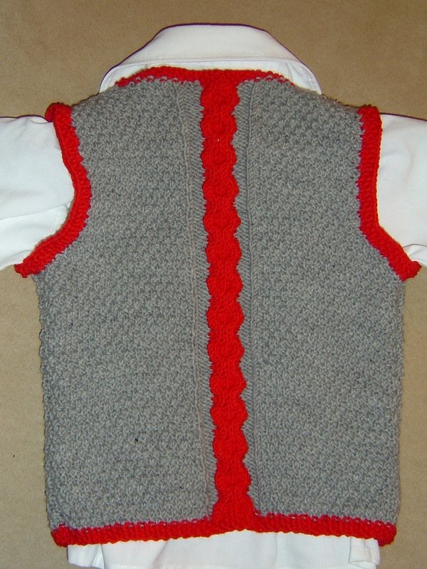 Die PDF-Anleitung ist bebildert. Der rote Zopf am Rücken ist in Intarsientechnik (Erläuterung ist enthalten) gefertigt und benötigt etwas Zeit und Geschicklichkeiten - würde ich für Strickanfänger daher nicht empfehlen. Der Zopf sieht auch in einfarbigem Grau schön aus, das gesamte Teil ist dann ziemlich schnell gestrickt. Strick-Anfängern empfehle ich, diese Weste komplett ohne Zopf und/oder einfarbig stricken.
