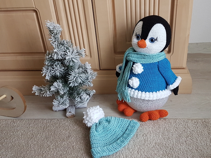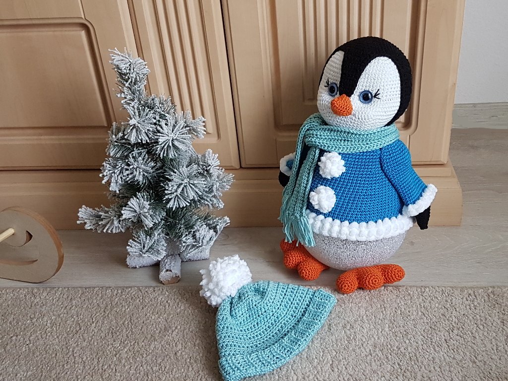 Nach Fertigstellung wird Pinguin Pino ca. 36 cm groß (bei Verwendung der angegebenen Nadelgröße und Wollstärke).