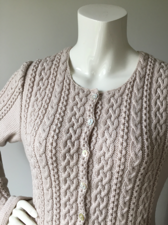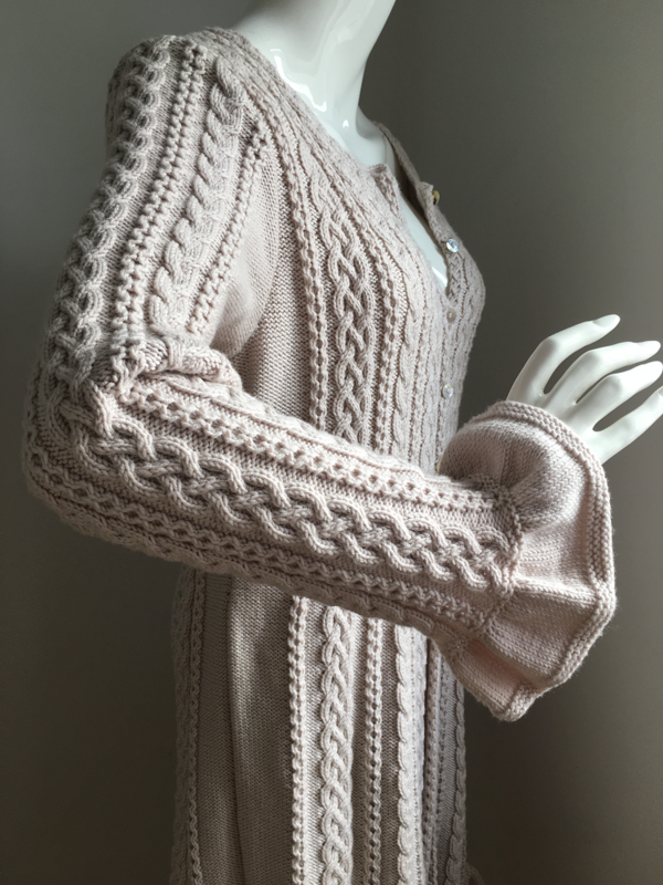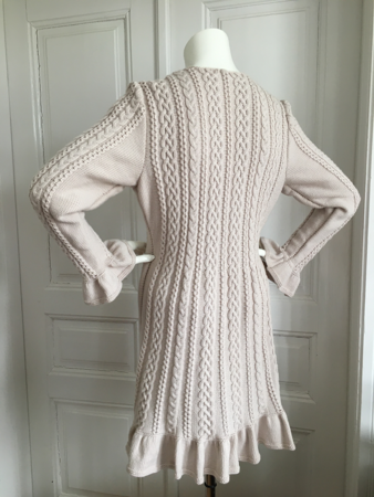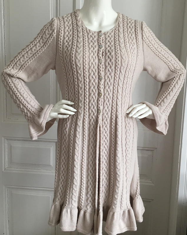 Anael ist eine wunderschön auf Figur geschnittene lange Strickjacke mit unterschiedlichen Zopfmustern rundherum. Der Volants machen sie sehr romantisch und feminin.